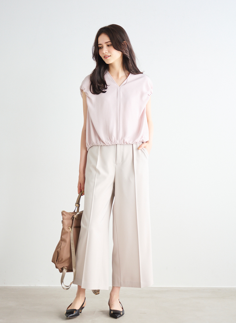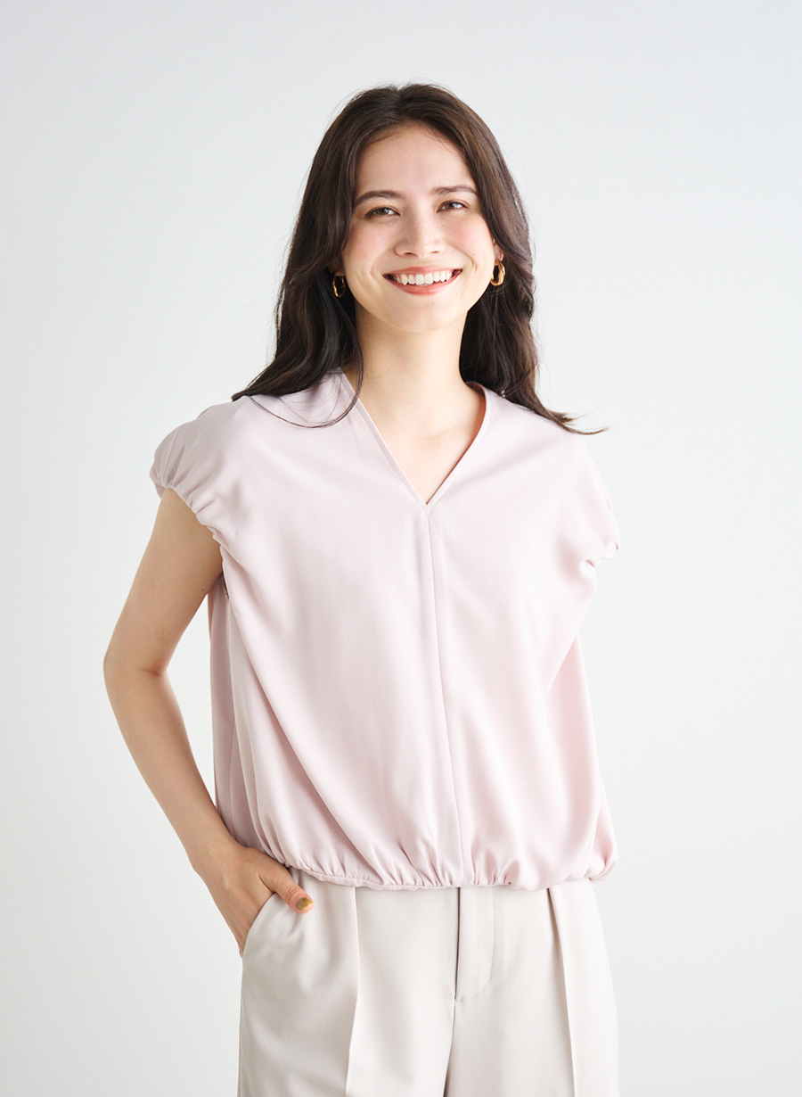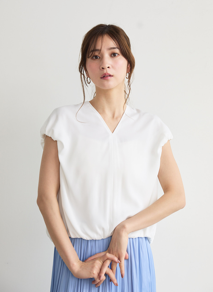 ・腕は出すぎず、襟ぐりはVネックにしてすっきりと着用できます。