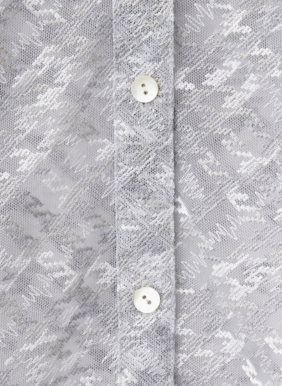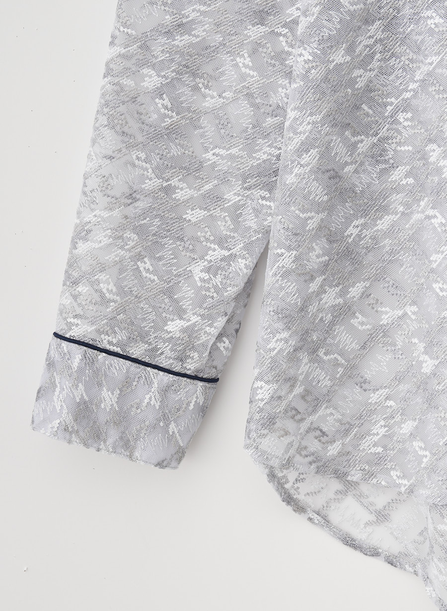 シアー感のあるチュール素材をベースに、チェックの柄を全面刺繍した素材を使用。