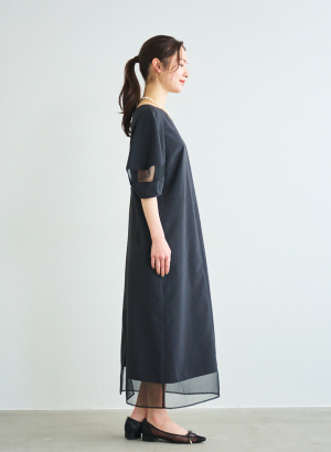 【着用感】軽くて肌に張り付かず、とても着心地が良いです!丈はしっかり長めですが、裾のシアー部分が軽い印象にしてくれます。MORE -