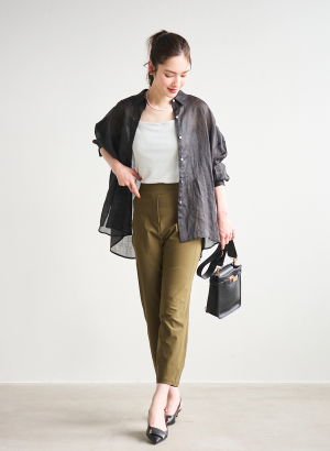 ・長めのトップスやボリュームのあるトップスにすっきり合わせていただきたい細身のパンツです。