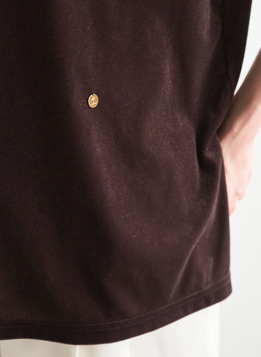 【素材感】シアーベロア素材。ポリエステルとウレタンの混紡で軽やか。裏側はさらさらとして肌あたりがよく、表のベロアも柔らかで心地よい質感です。シワにならず、薄地で快適。深みのある色合いが魅力で、透け感は感じ難い。