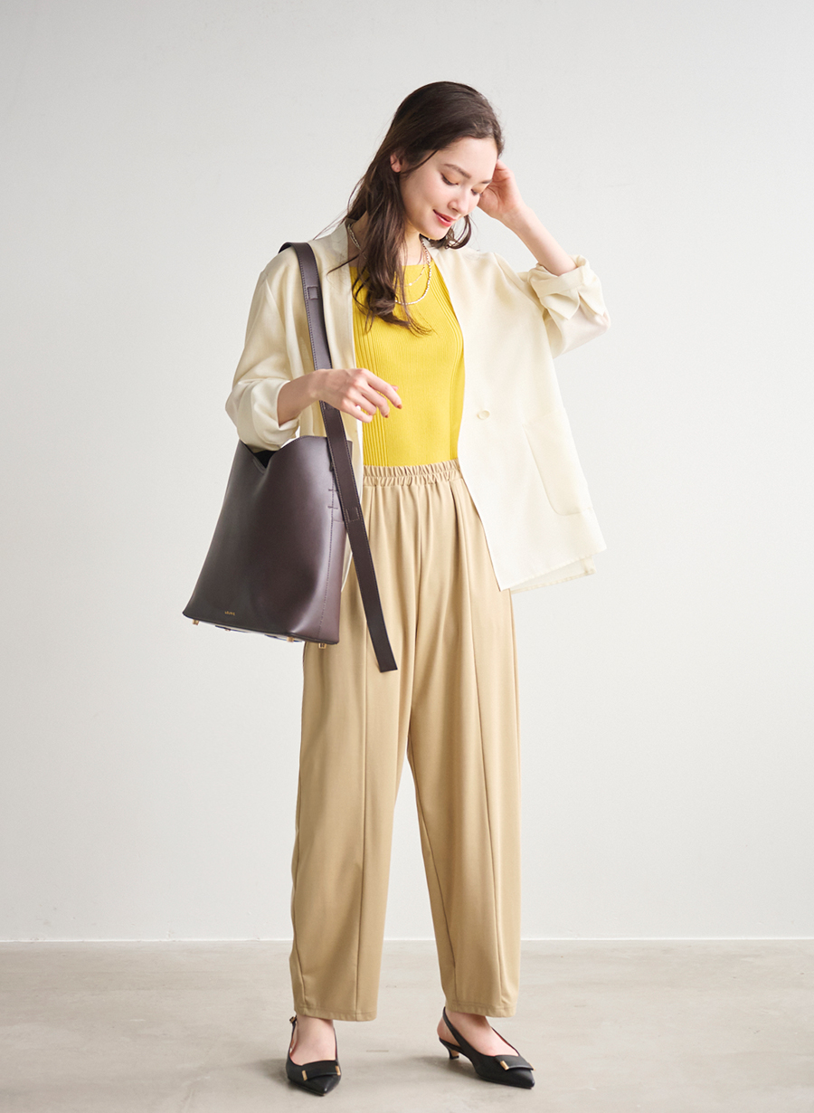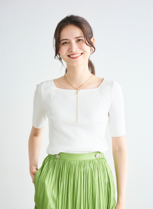・身頃のランダムリブがデザインポイント。巾や配置にもこだわり、着用した時にスタイルアップ効果が生まれるように工夫しました。