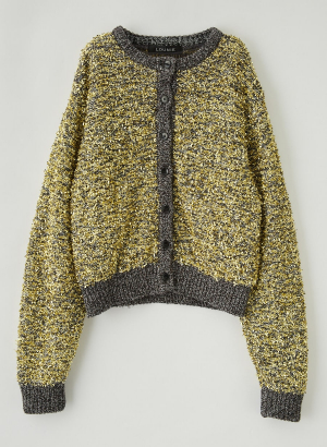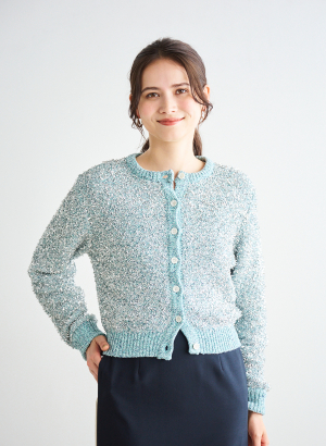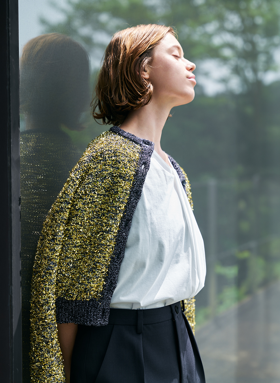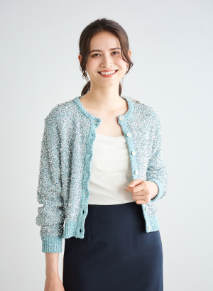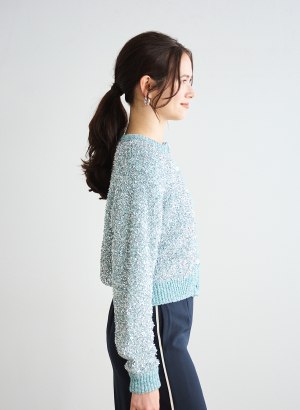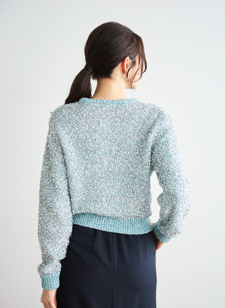 ・メタリックヤーンと杢糸を使用して表情豊かな編み地に仕上げ、キラキラとした華やかさのある素材感で着映える1枚。