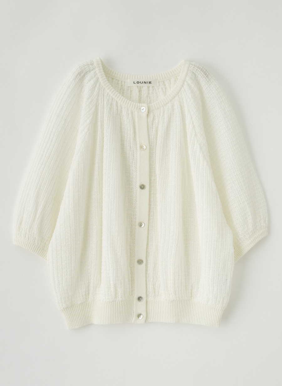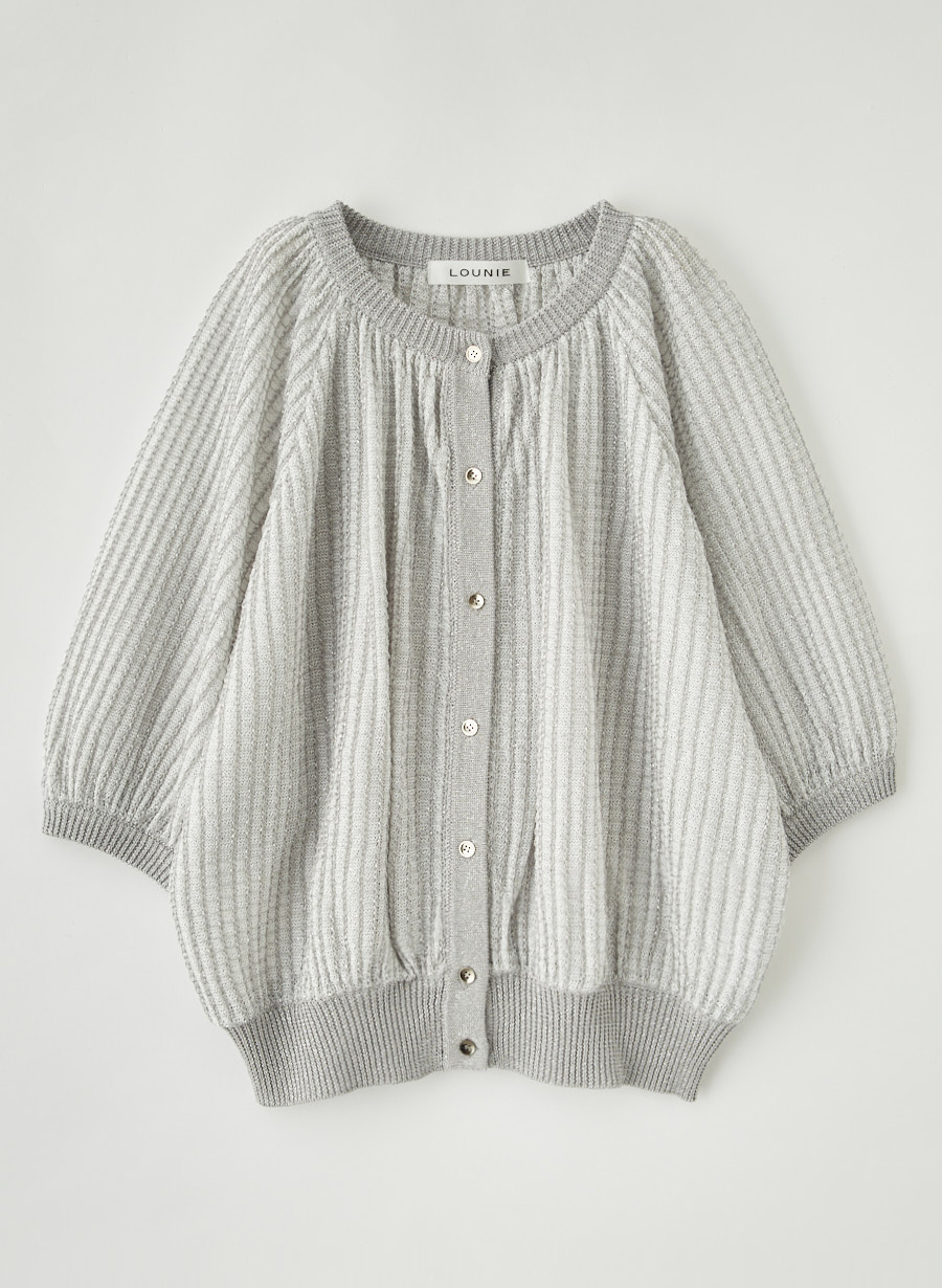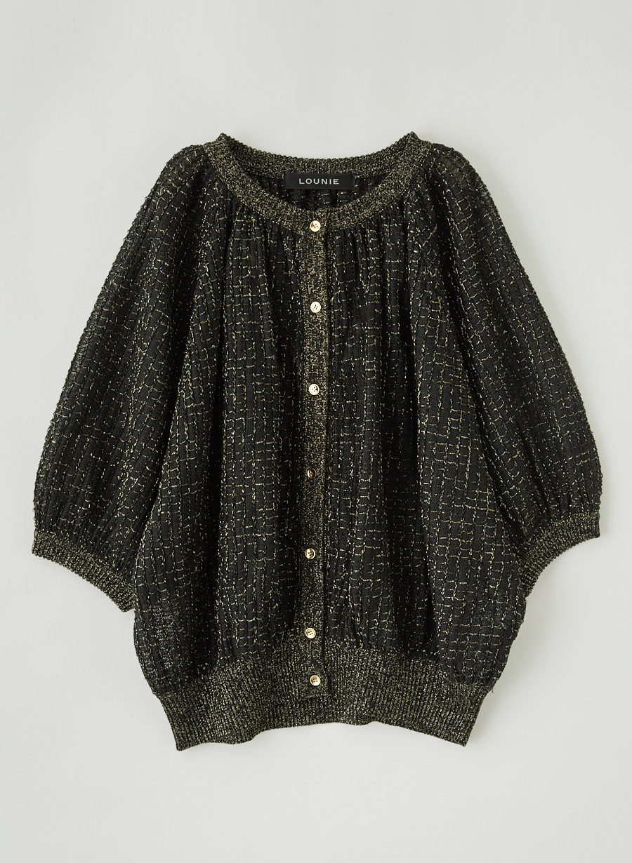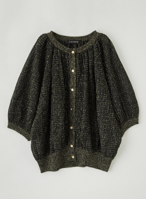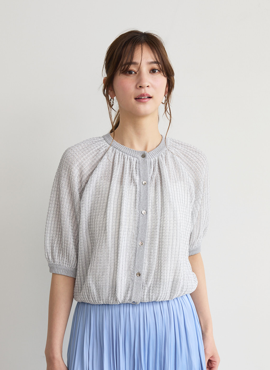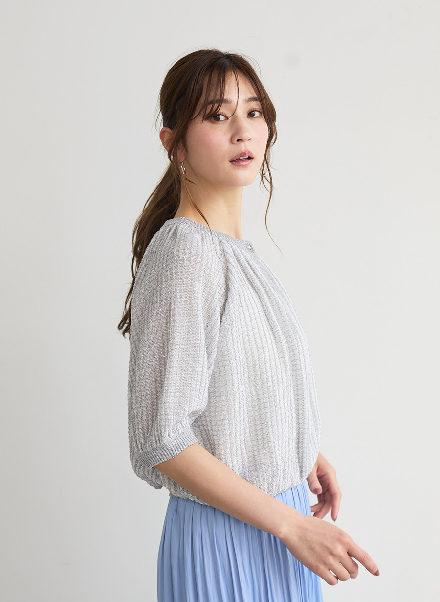 ・透け感のあるベース素材にラメ糸を織り交ぜることで、軽やかで表面感のある華やかな編地に仕上がりました。