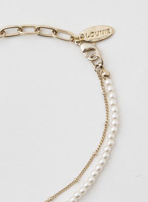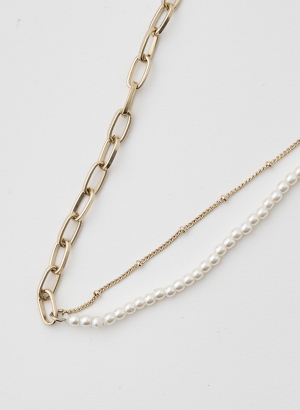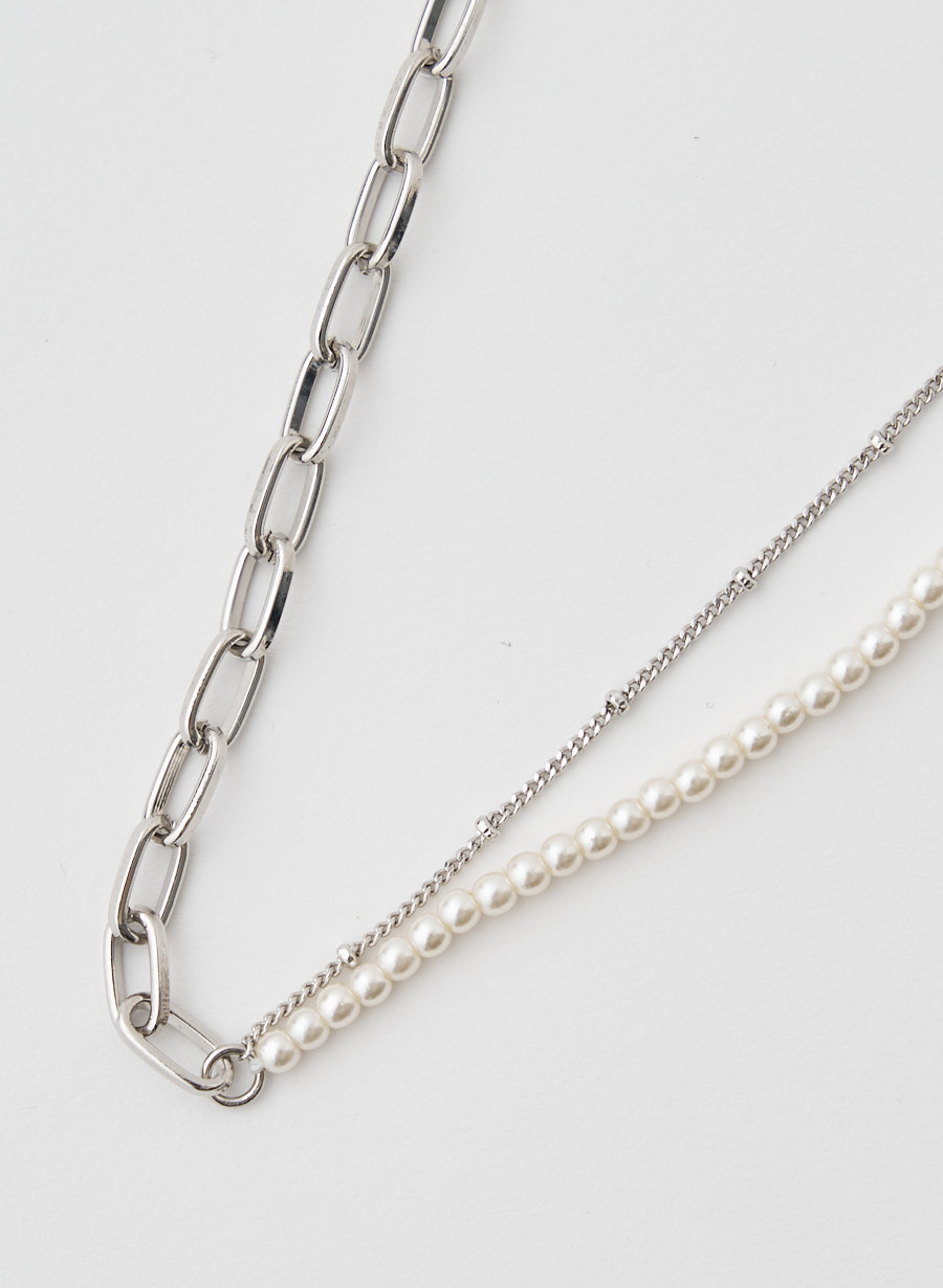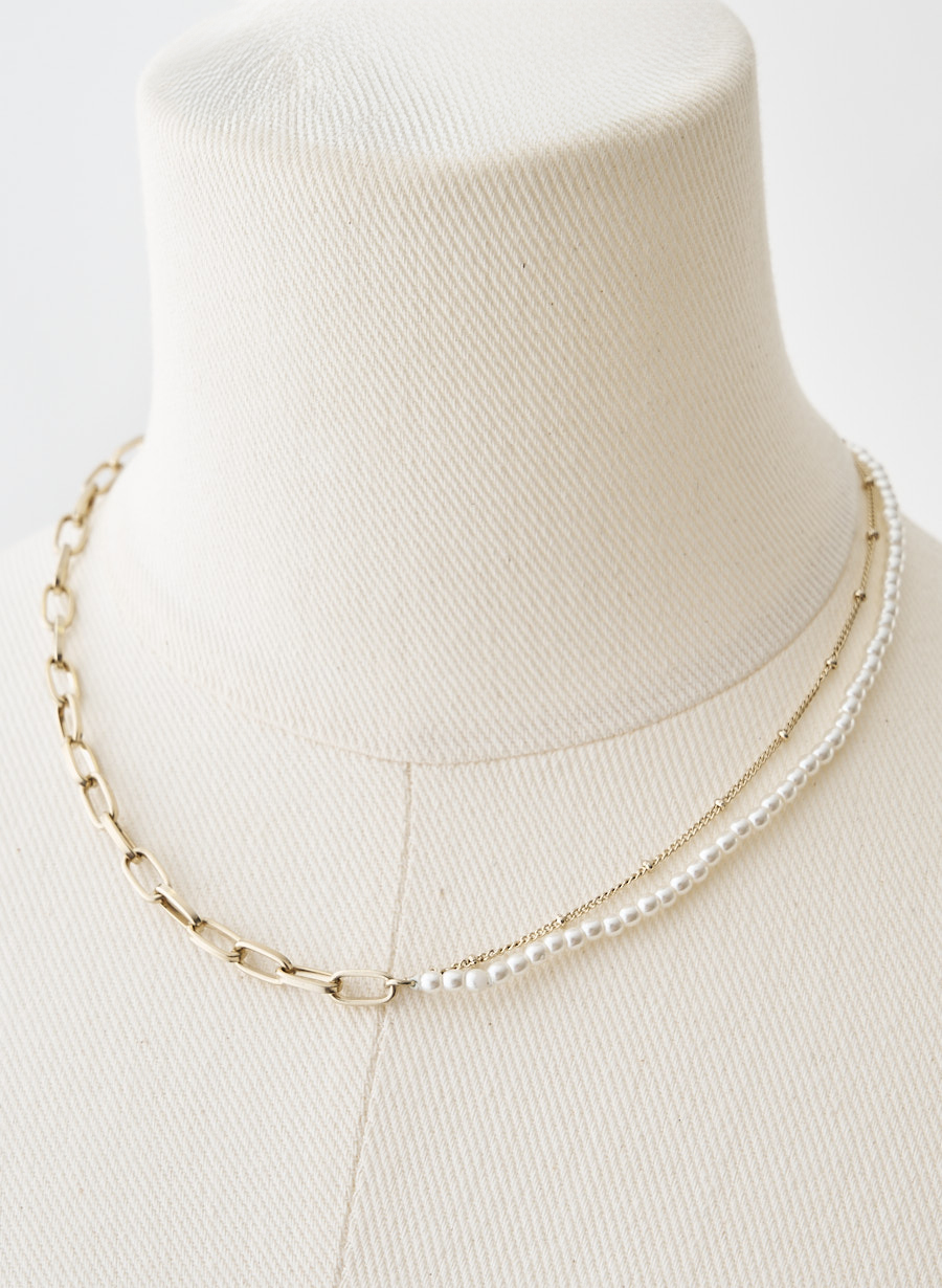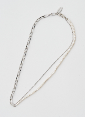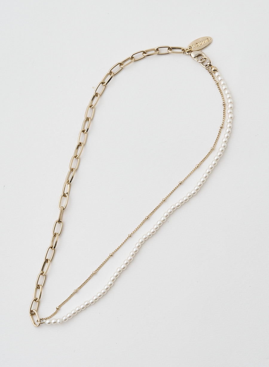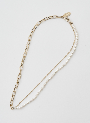 小粒のパールと2種類のチェーンを組み合わせた、パール×チェーンのショートネックレス。シンプルな角線コマのチェーンを使用し、スタイリングにも合わせやすいシンプルなデザインに仕上げました。38cmのショートタイプなので、お手持ちのロングネックレスと重ね付けしてお使い頂くのもおすすめです!