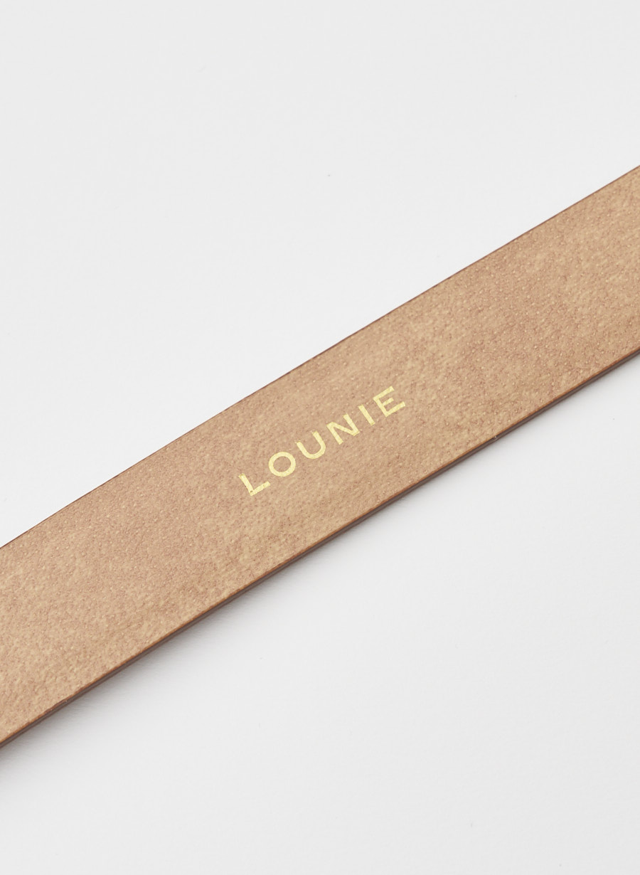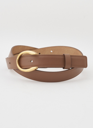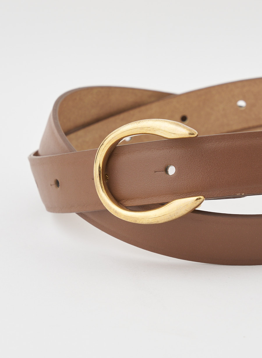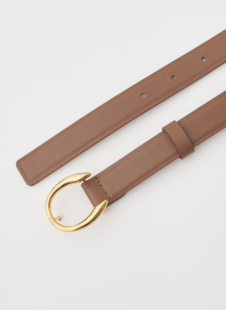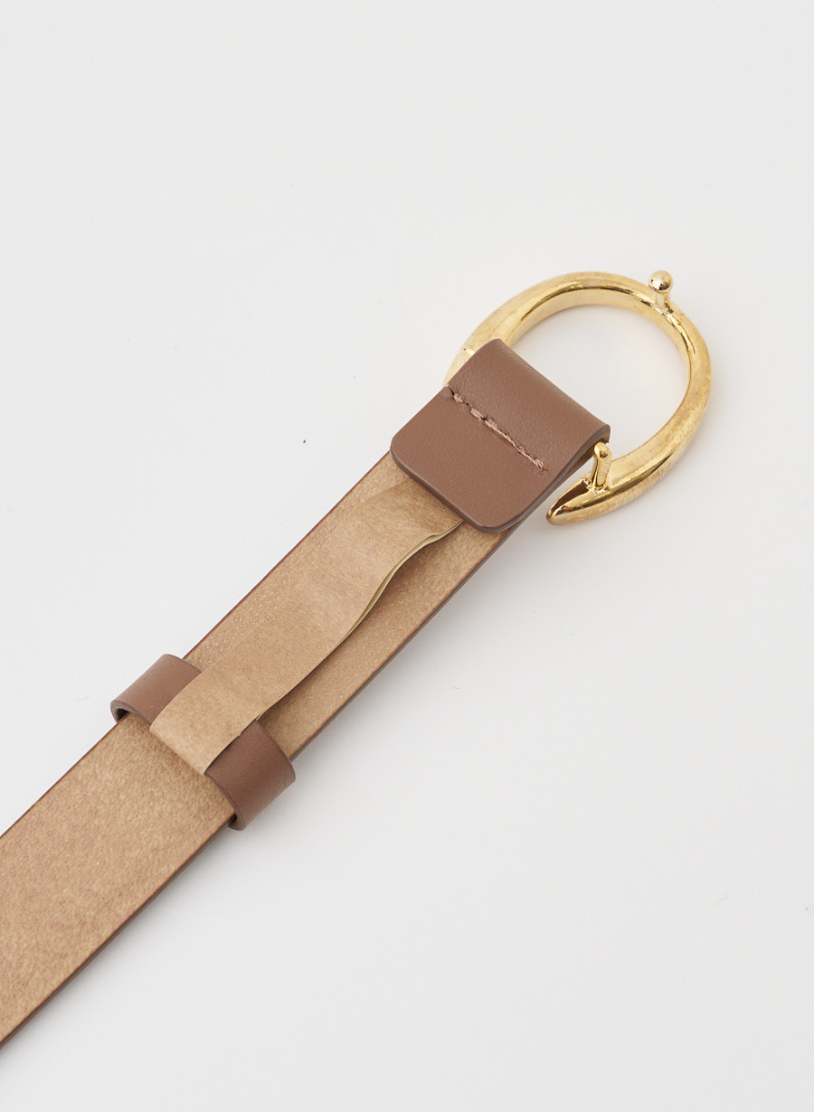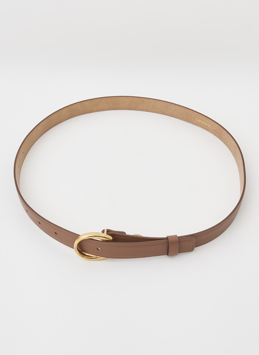 オイル調の牛革を使用した中幅サイズのベルト。馬蹄型のようなバックルを使用したデザインベルトで、芯を入れて盛り上げたフェザー加工により、高級感のある印象に仕上げました。9穴付きでサイズ調整の幅が広いので、ウエストマークとしても、パンツ合わせのジャストベルトとしてもお使い頂ける便利なアイテムです。