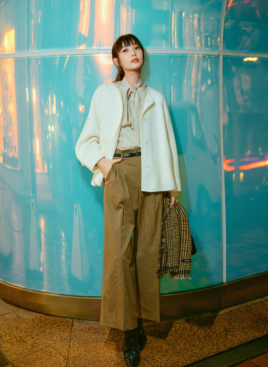 この生地に細番手のラメをカバーリングした別注糸を織り込む事で、繊細な輝きをプラスして今年らしい素材感に仕上げました。