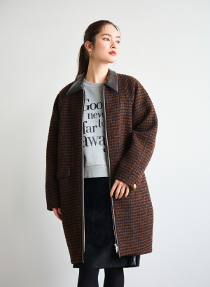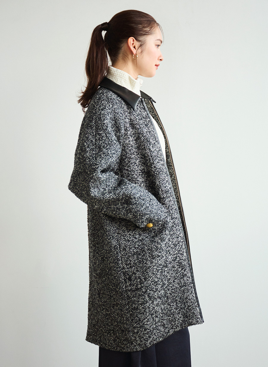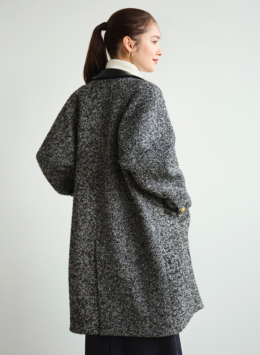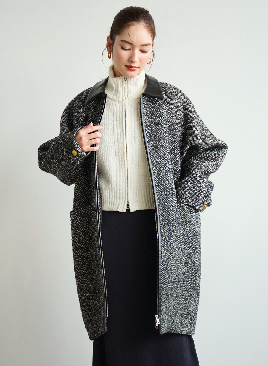 ・クラシックなツイードとフェイクレザーの切り替えが今年らしいデザインコート。