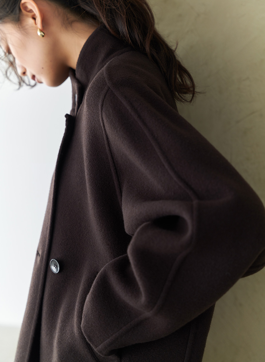 生地で微起毛加工を施しメルトン仕上げにする事で、適度なハリ感をもたせ仕立て映えのする素材感に仕上げました。