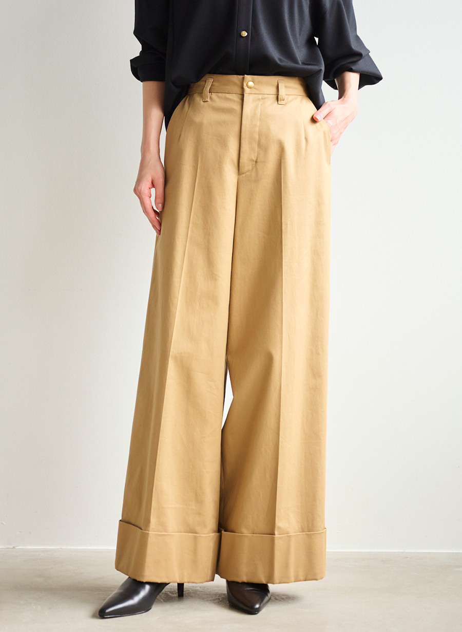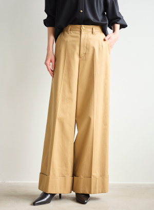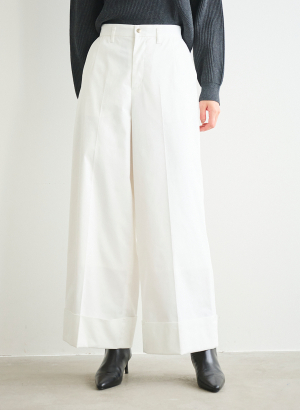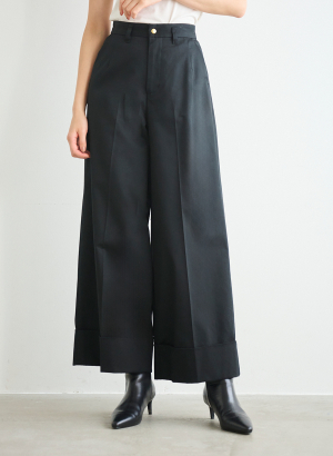・裾のターンバックデザインがマニッシュな印象のワイドパンツ。