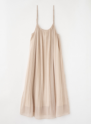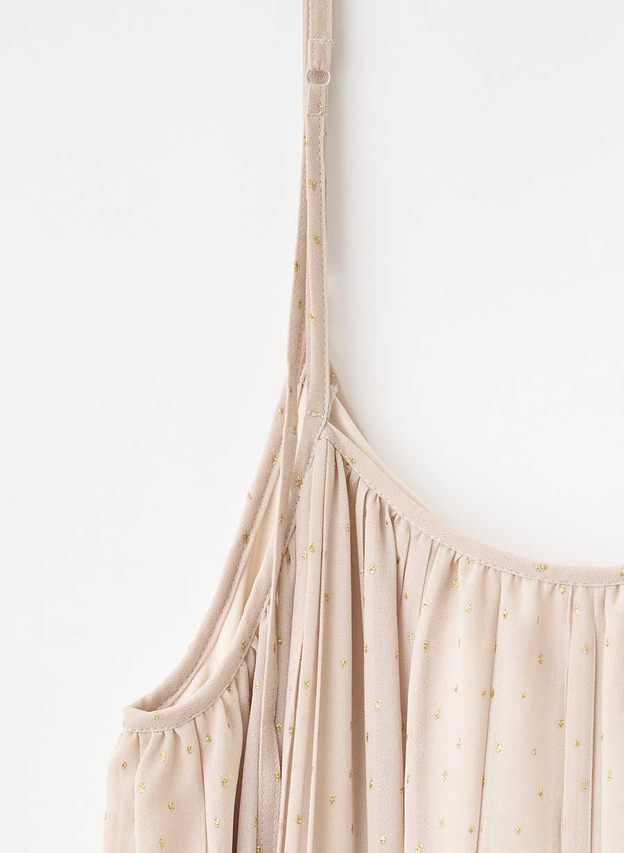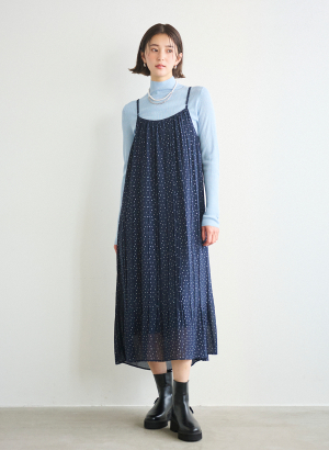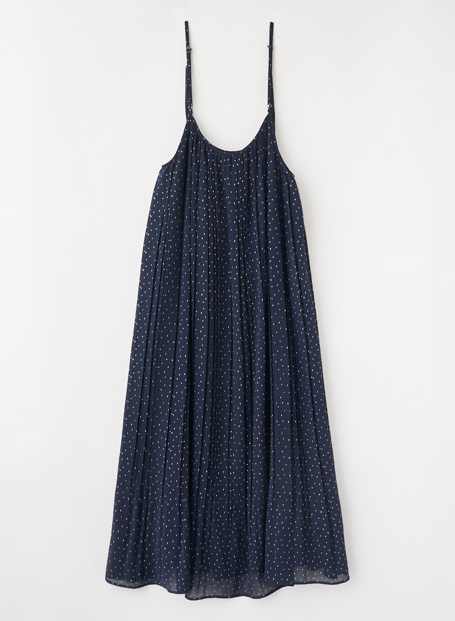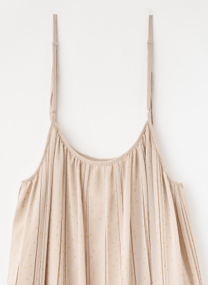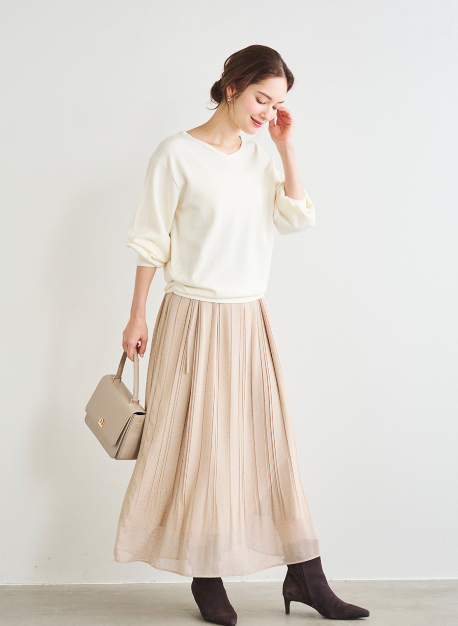 ・華やかなグリッタードットが煌めく素材に、細やかなプリーツを施すことで、ドット柄が単調にならず、奥行きのあるニュアンス豊かな表情を見せます。