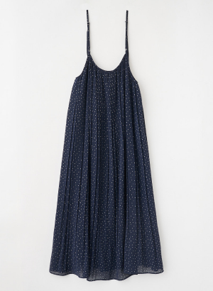 オリジナルで描いた小さめのランダムなドット柄をグリッターでプリントする事による、繊細な輝きをもったトレンド感のある表情がポイント。