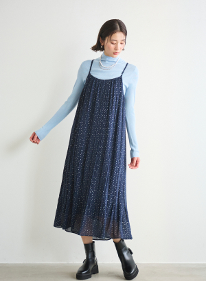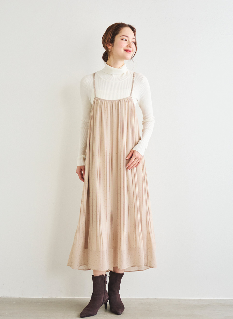・全体に施されたプリーツが、縦のラインを強調し身体のラインを拾いすぎず、すっきりと見せてくれます。