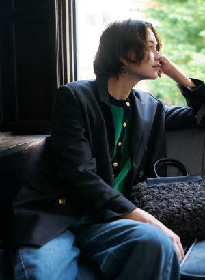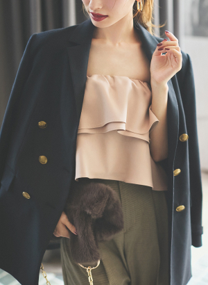 【着用感】肩パッドがあるのでハンサムに着れます!金ボタンと手首のベルトがアクセントになりクラシカルな印象に!ベルトは取り外せるのでシンプルにオフィスでも活用いただけます!