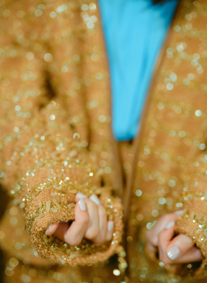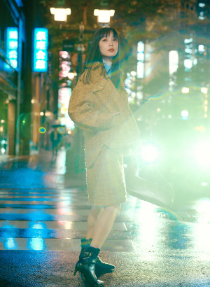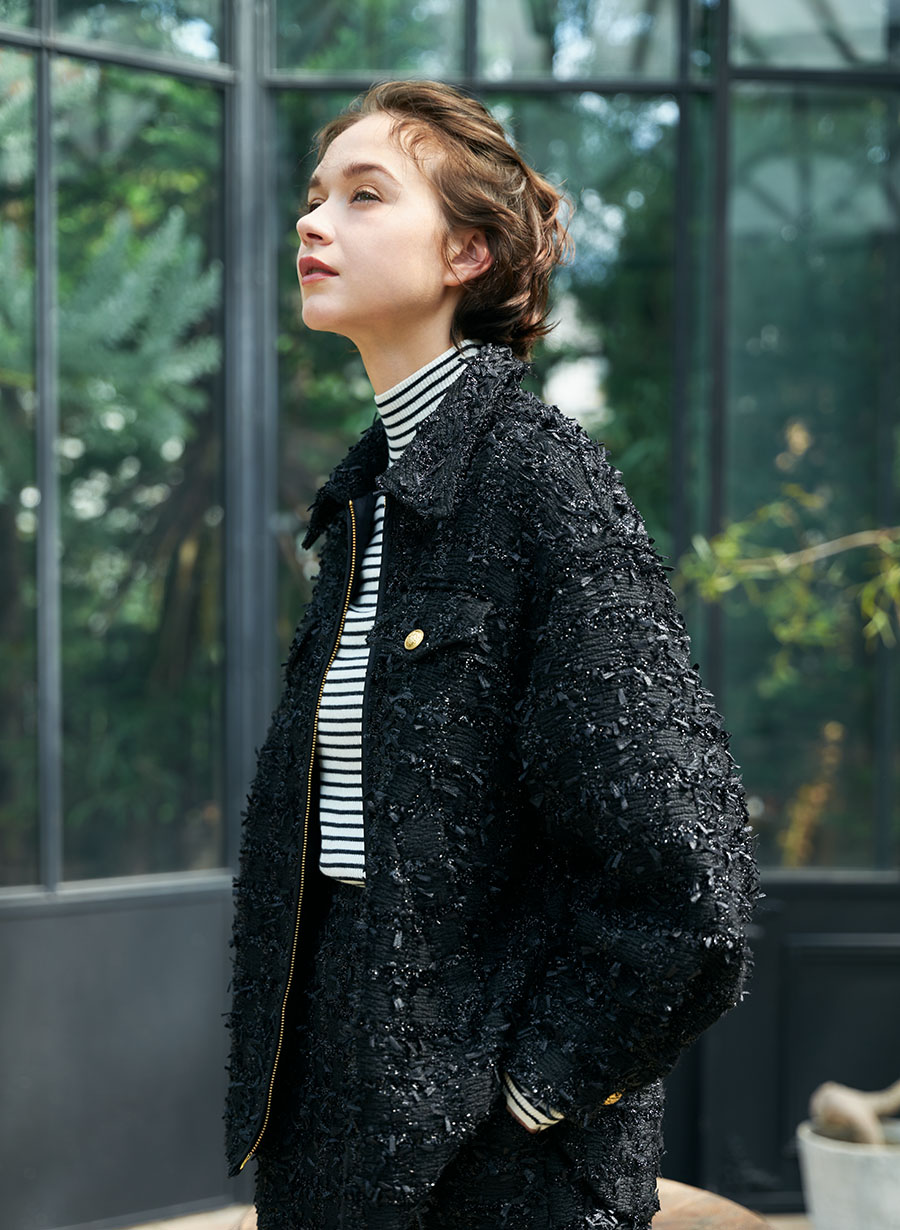 太番手のロービング糸をベースにラメモールの意匠糸で格子柄を作り、抄繊糸使いのフラッグヤーンでアクセントをつける事で付加価値の高い素材感に仕上げたオリジナルのツイード素材を使用。