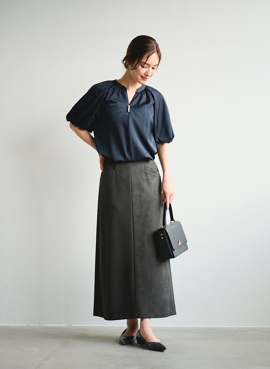 ・きれいめなシルエットに衿元のスキッパーがポイント。