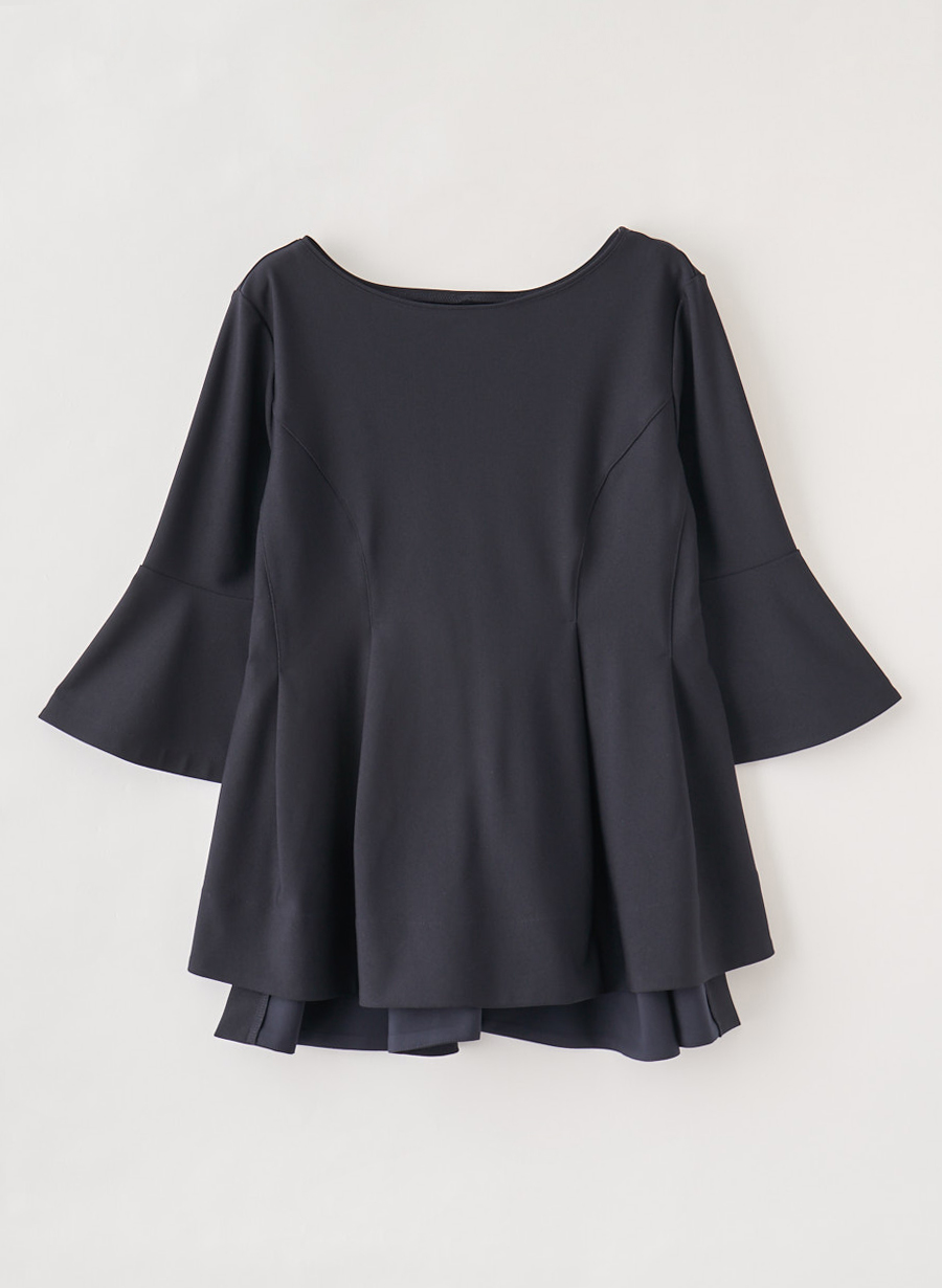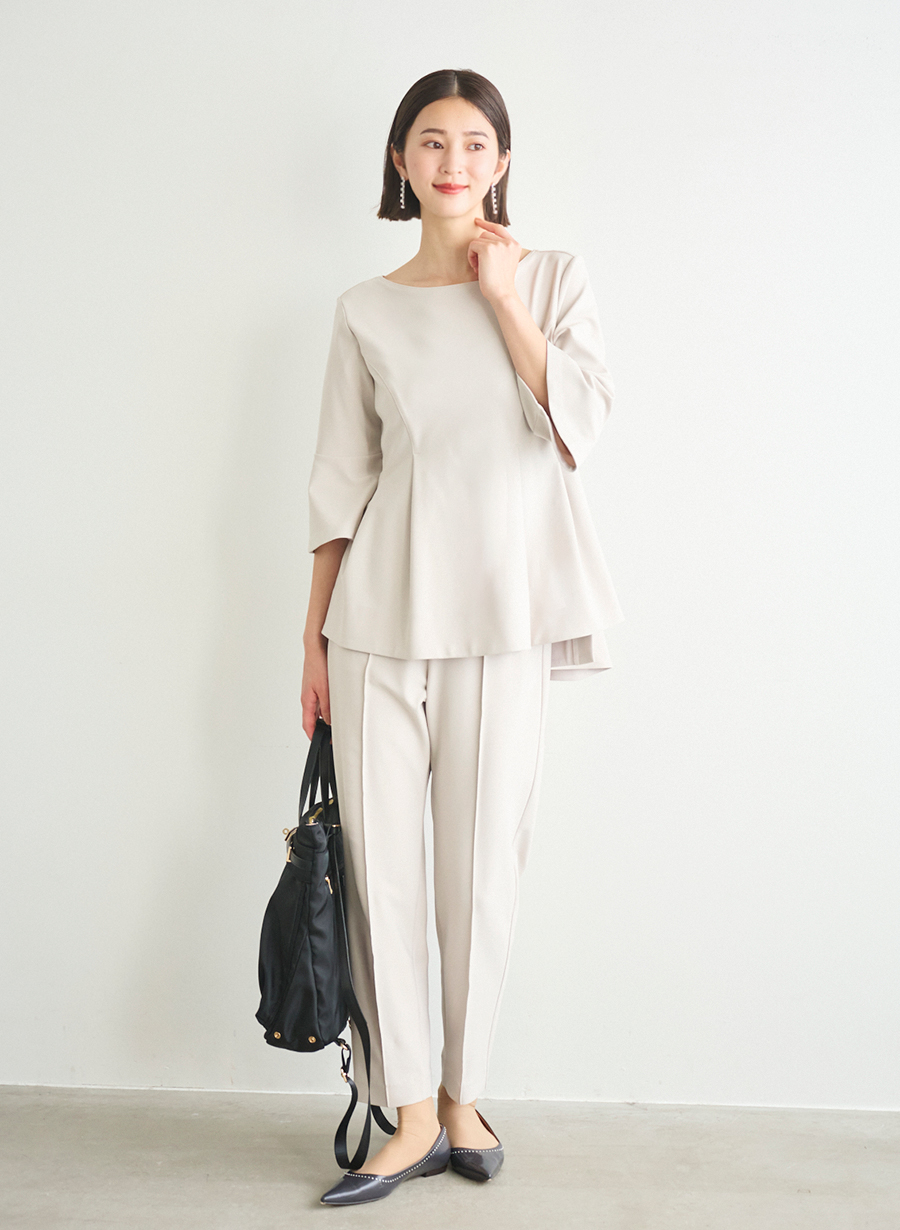 ・ウエストで切り替えず、身頃から続くタックでのペプラムデザインが、大人っぽく上品な印象を与えます。
