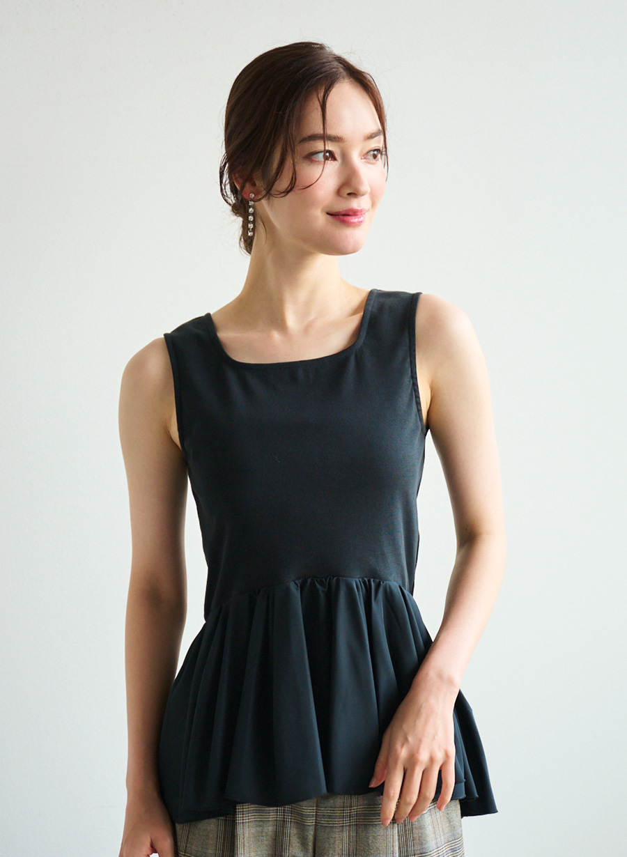 ジャケットやカーディガンのインに着用した際、すっきり見えさせてくれます。