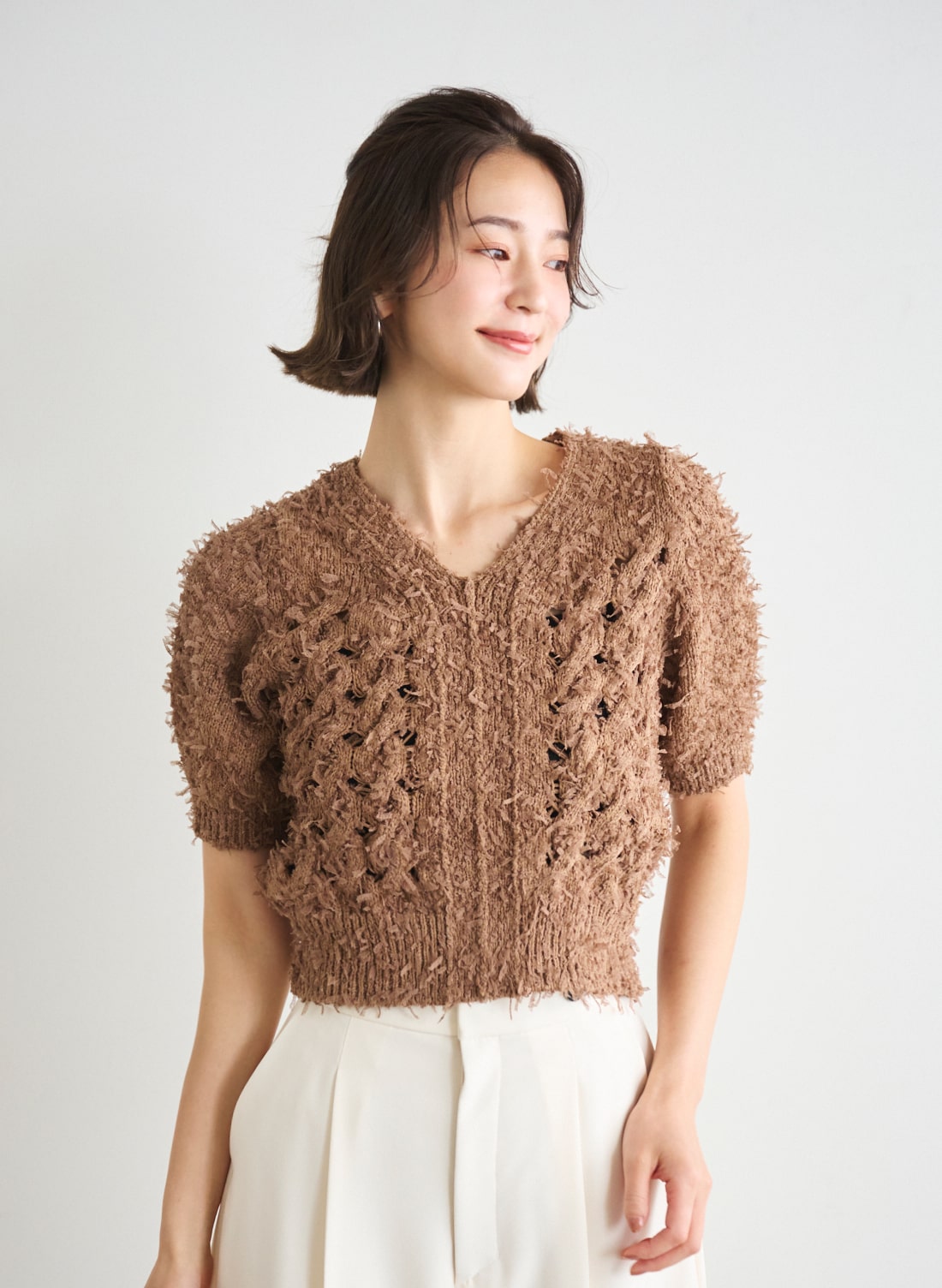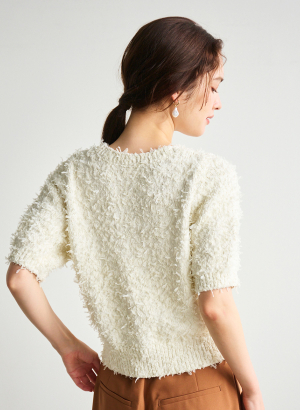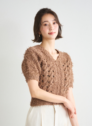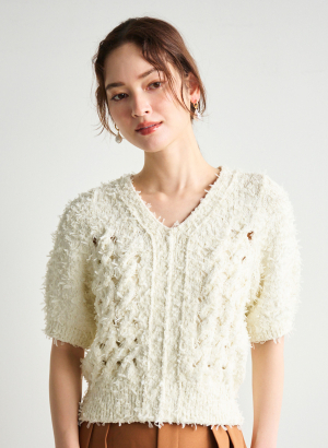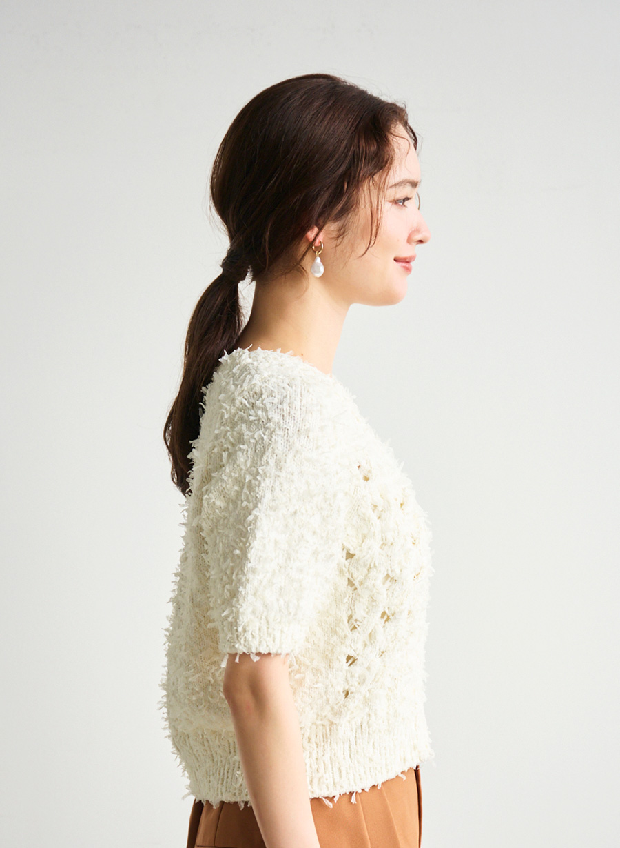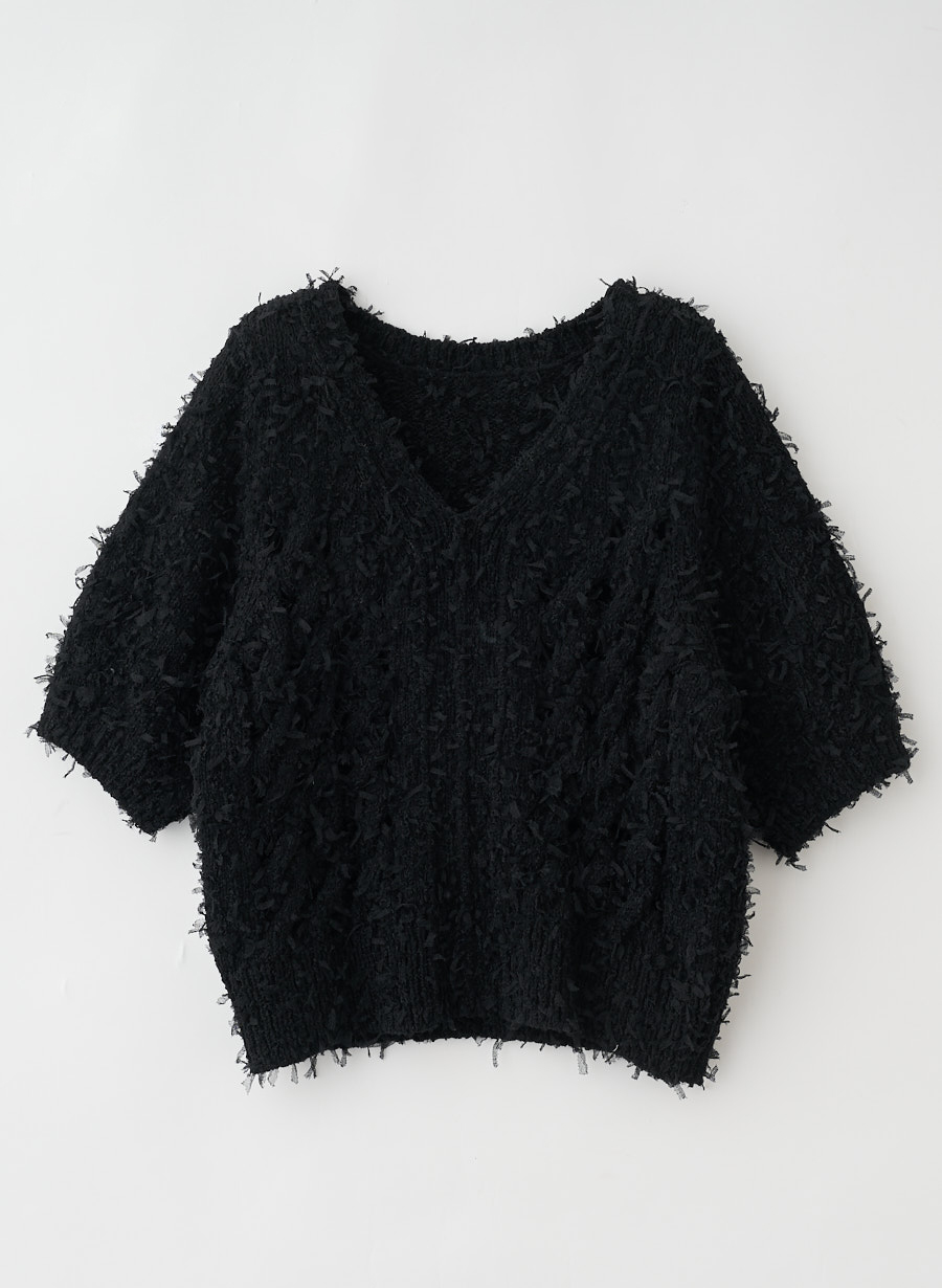・チュールリボンを引きそろえた編地が特徴的なニットプルオーバー