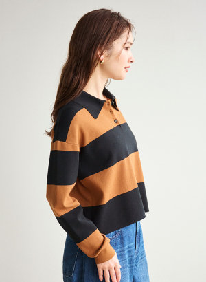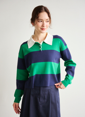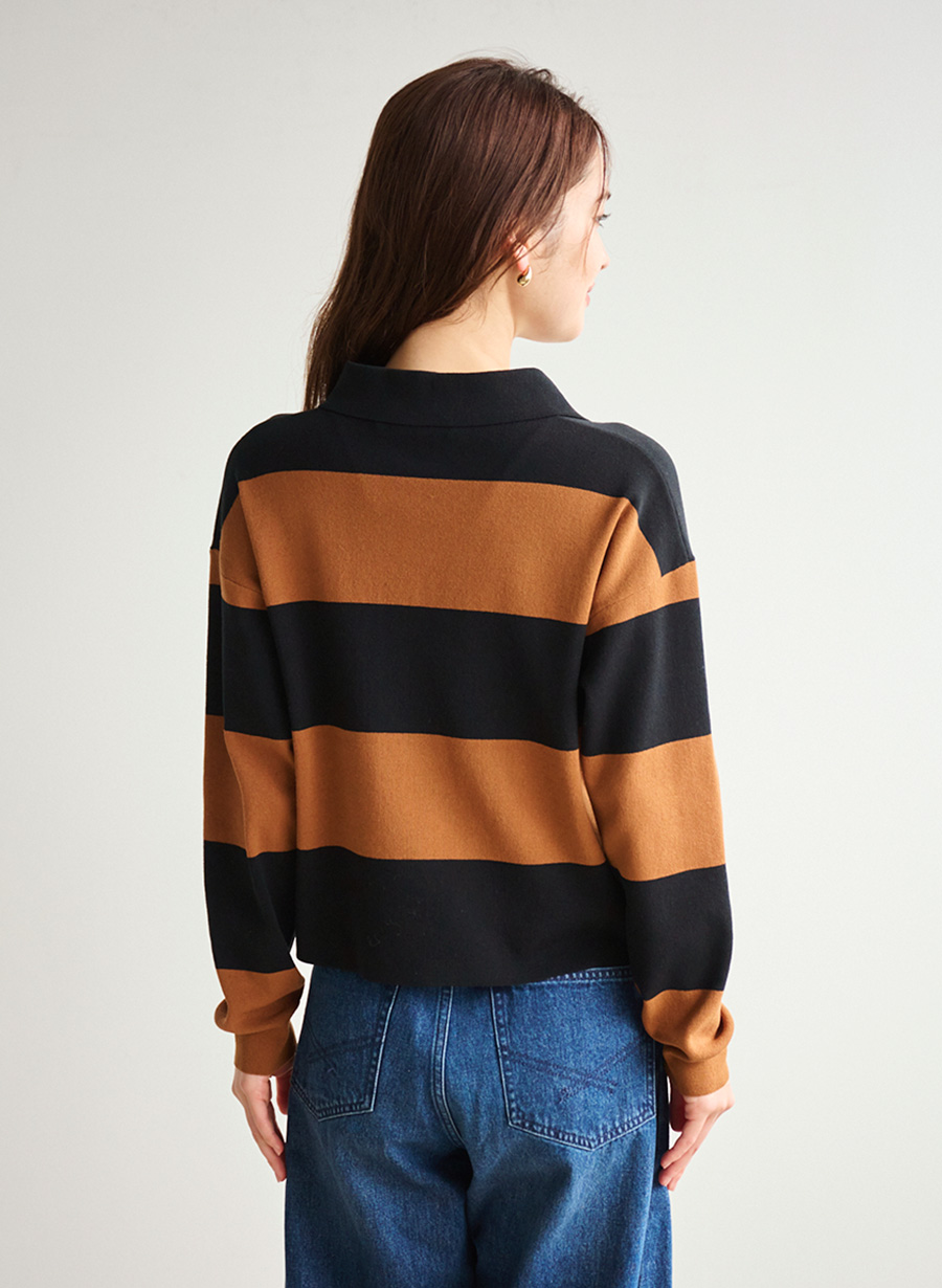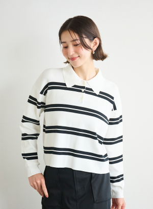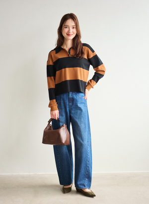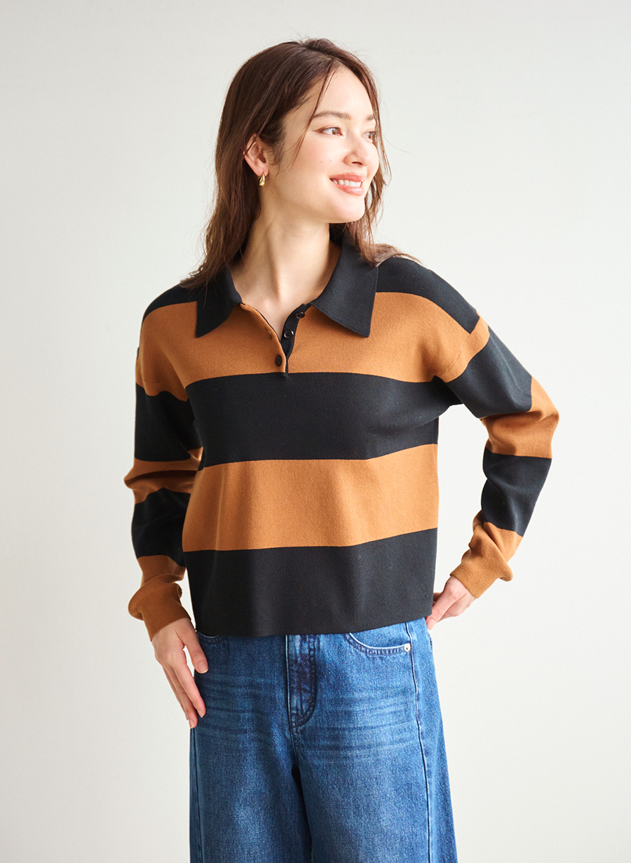 ・トレンドのラガーシャツを女性らしく着こなせるよう、ニットで表現しました。