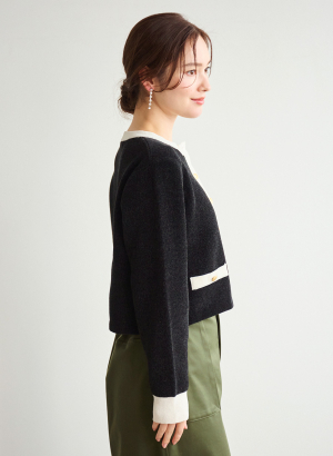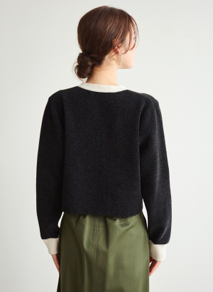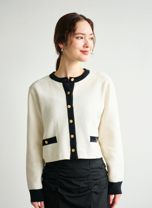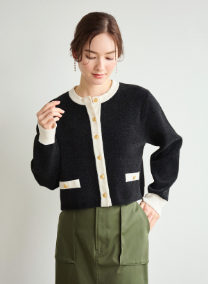 ・配色デザイン×金ボタン使いがクラシックなデザインカーディガン。