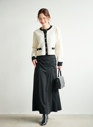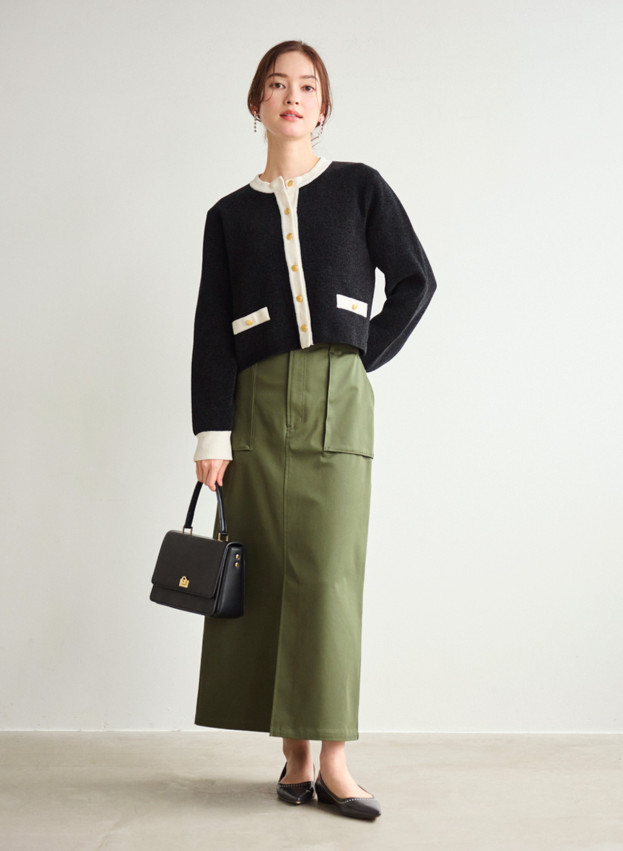 【着用感】取り入れやすさもありつつ、バイカラーや金ボタンのデザインがコーデを一気に華やかにしてくれます◎すっきりとした丈感なので、ワンピースの羽織りなどにもおすすめです!MORE -