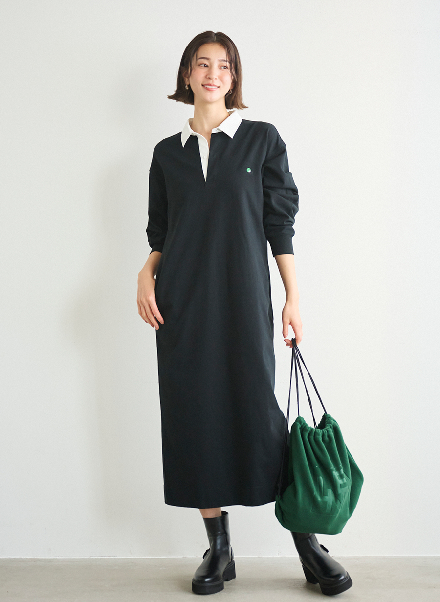厚手のコットン素材を使用したワンピースはラガーシャツ風のロング丈で、ゆったりとしたシルエット。