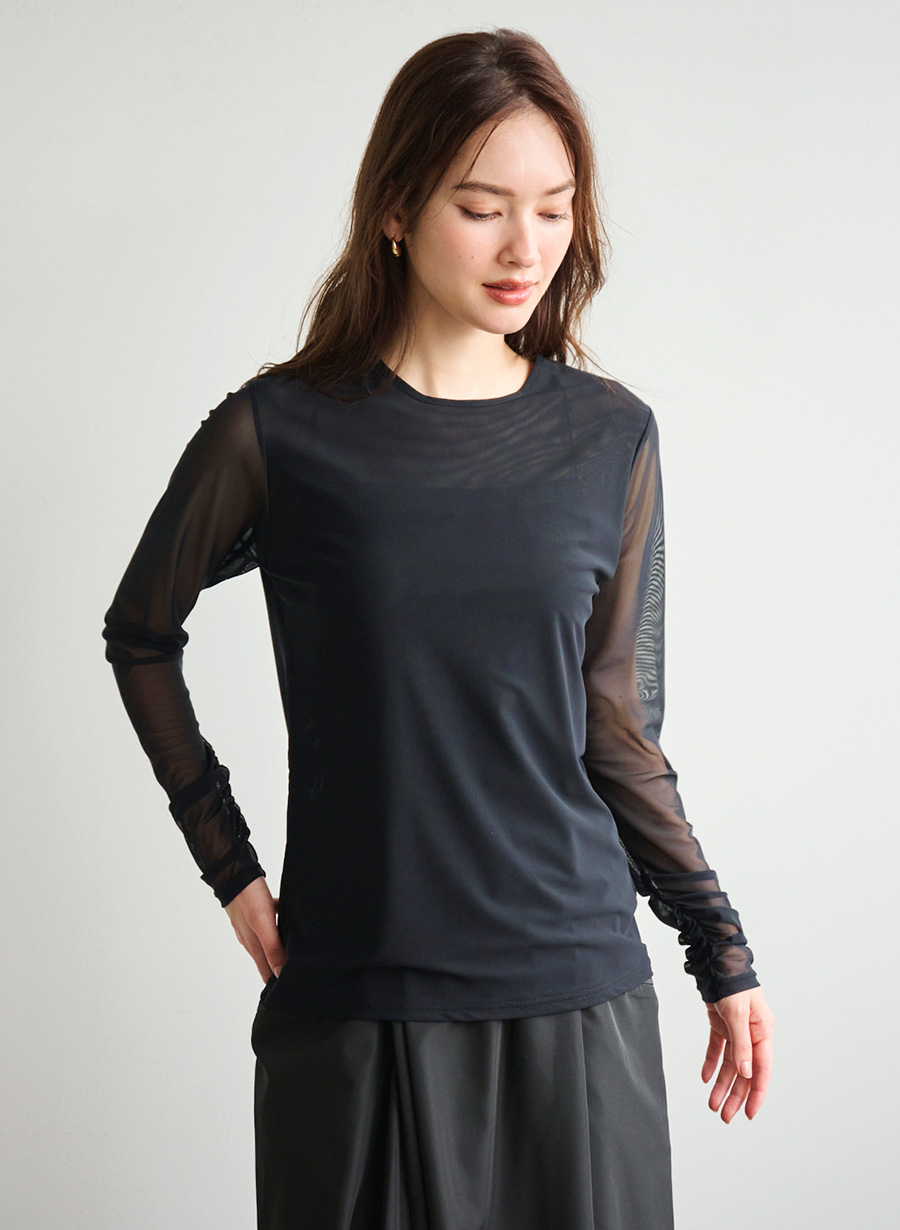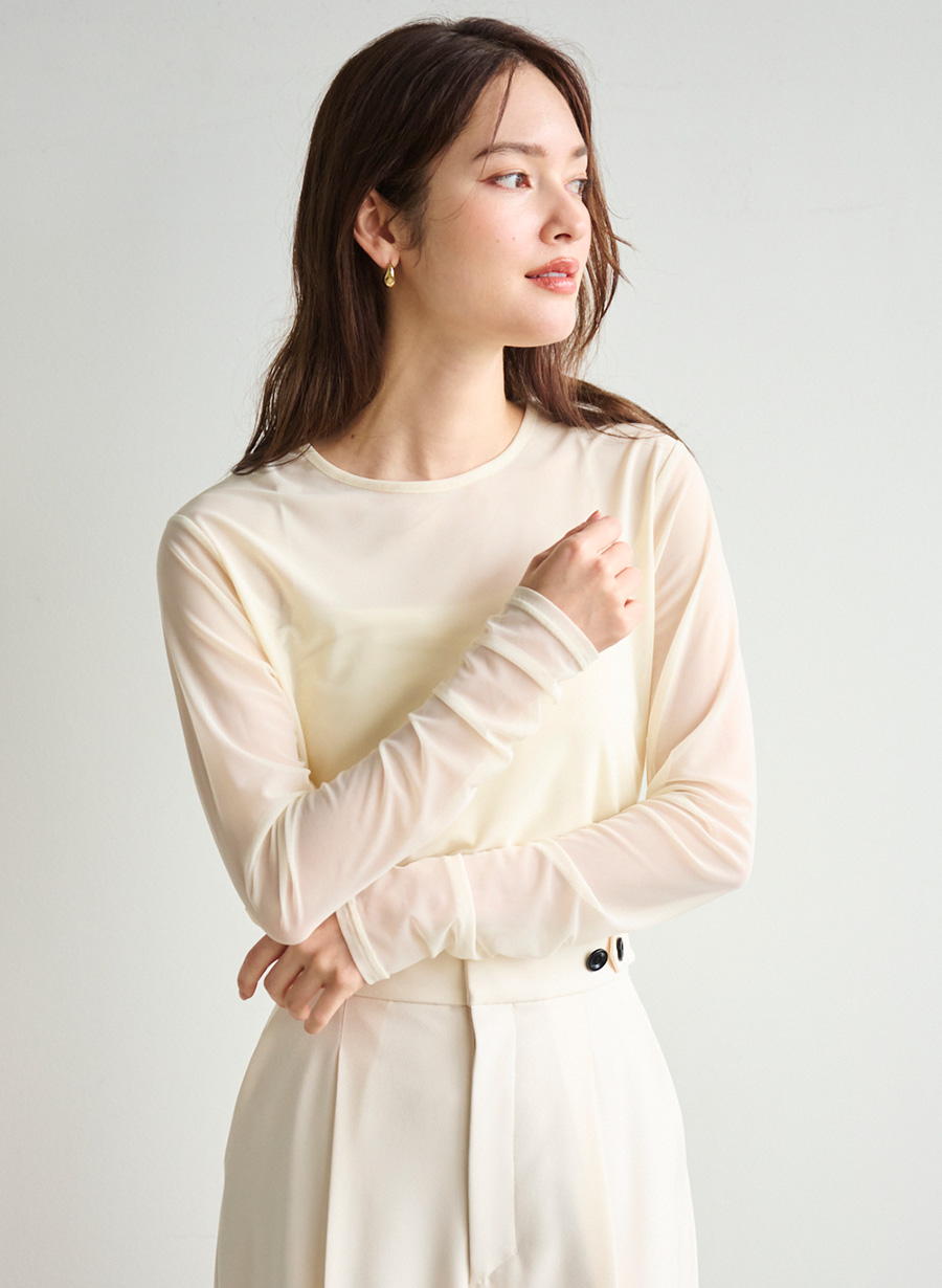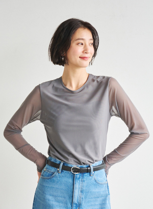 この生地を2枚重ねにする事で適度な透け感のある表情に仕上げた、レイヤードに最適なインナーアイテムです。