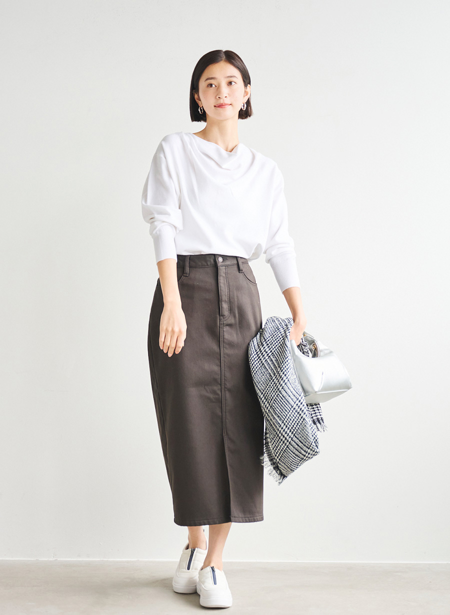 ・適度な素材の厚みとストレッチ性により、シルエットがしっかり細見えする体型補正効果が嬉しいポイント。
