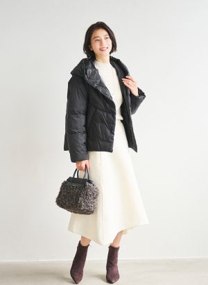 ・1枚で決まるワンピースで、さらにジレやジャケットなどと着合わせやすいサイズ感がポイント。