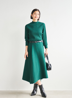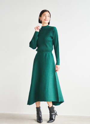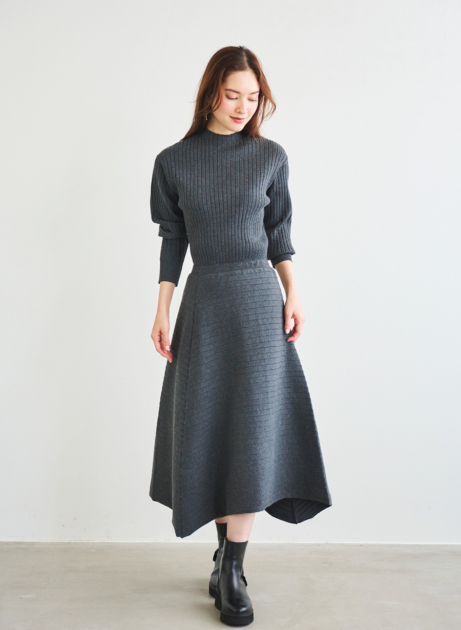 ウール混の素材を使用し、ワイドリブで編み上げたニットワンピース。
