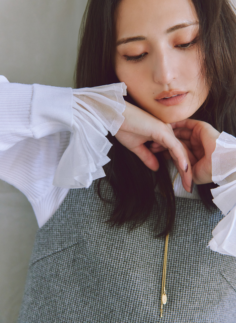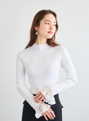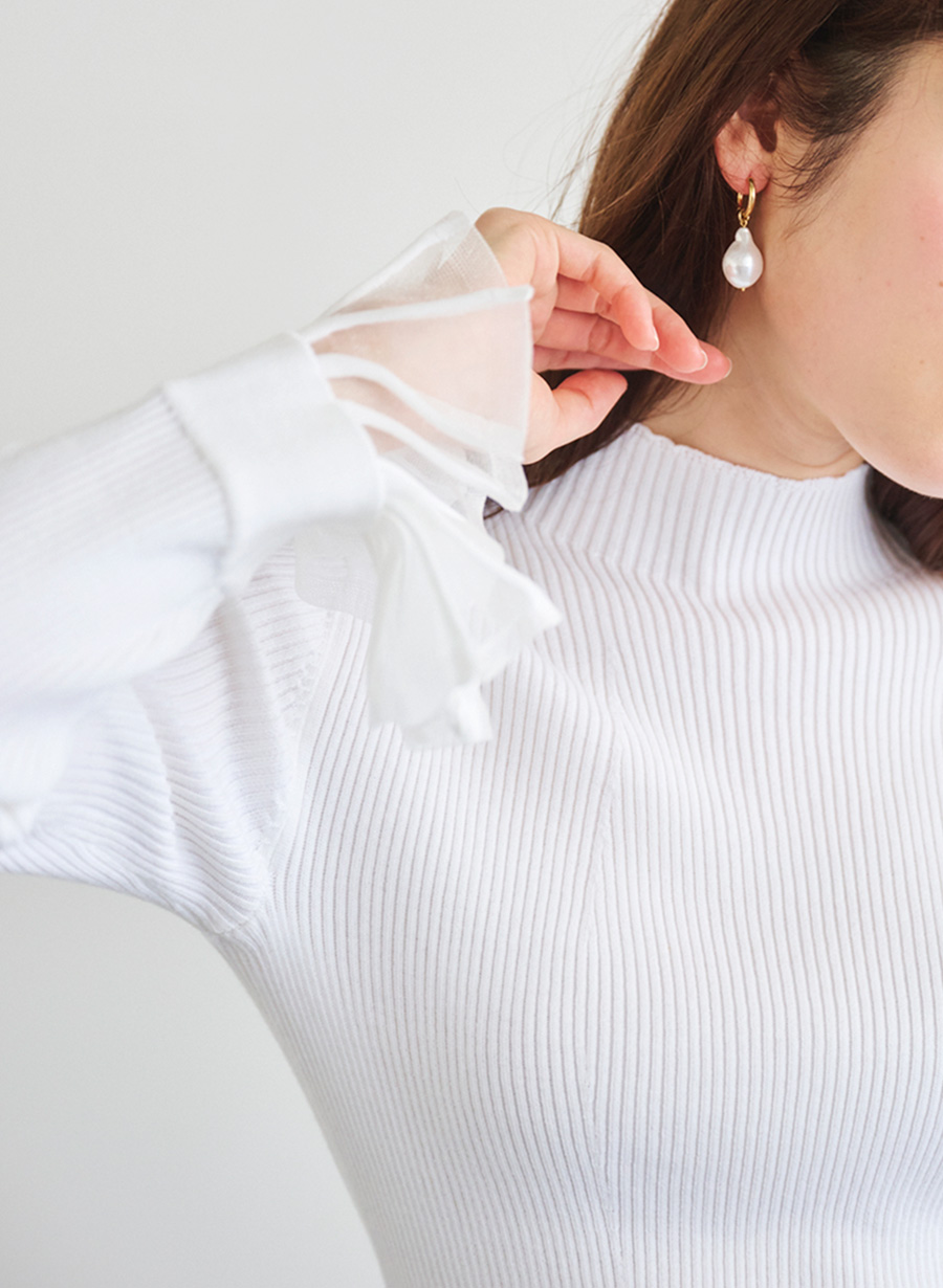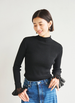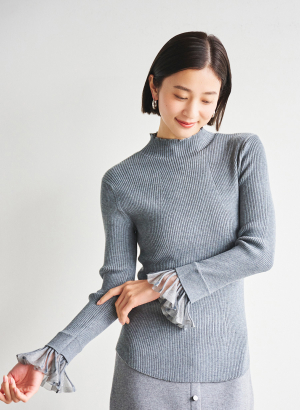 ・袖口のフリルはシアー素材と交互に編み、手元を華やかに見せます。