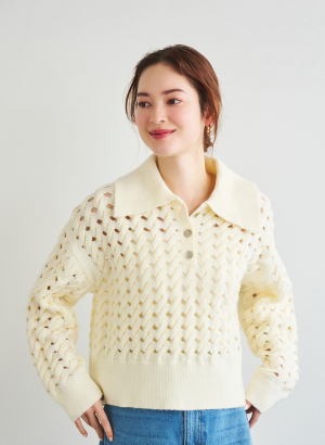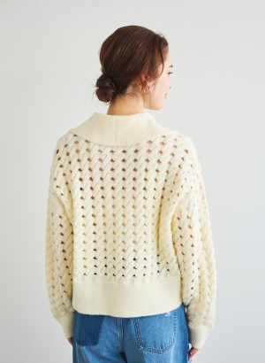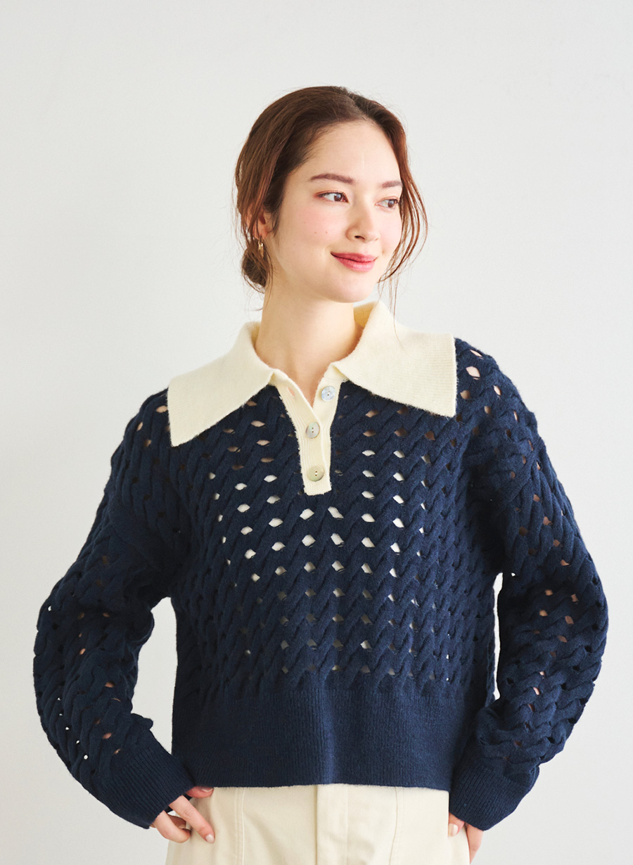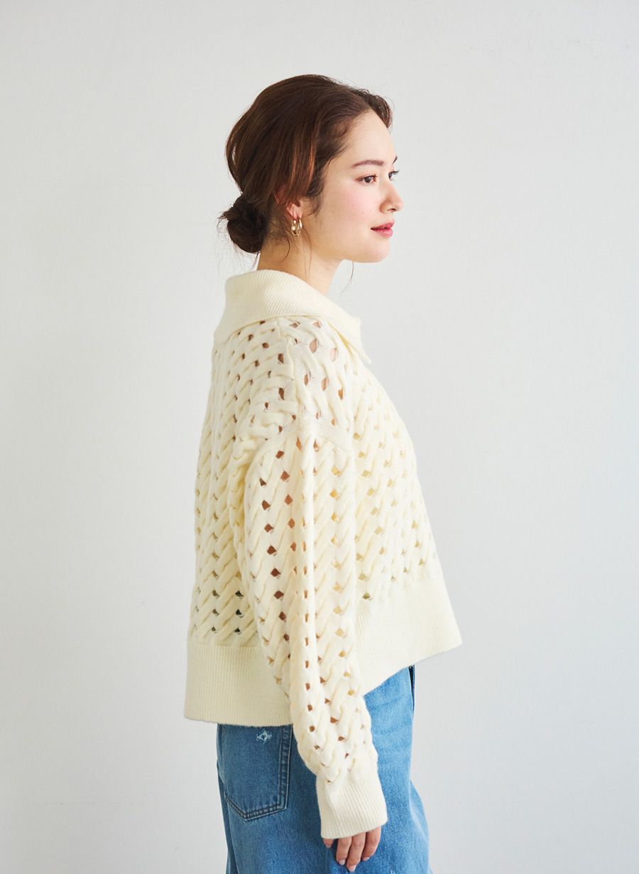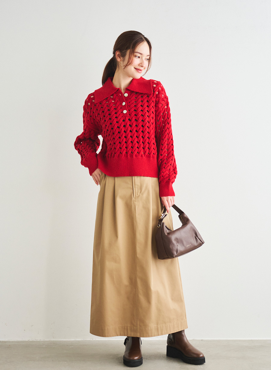 ・冬らしいケーブル柄ニットですが、厚すぎないのでアウターも選ばず気軽に取り入れられるアイテムです。