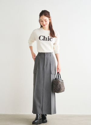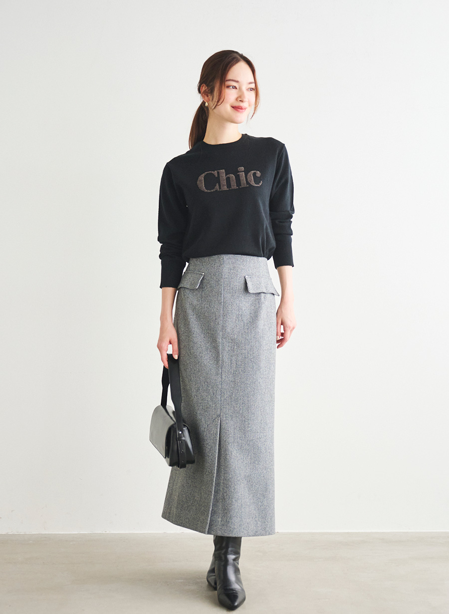 ・程よくゆとりのあるシルエットで、スカートでもパンツでも合わせやすいバランスです。