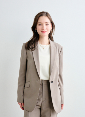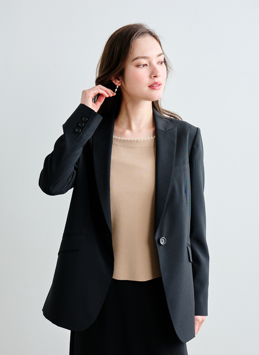 ・ピークドラペルが印象的なテーラードジャケット。
