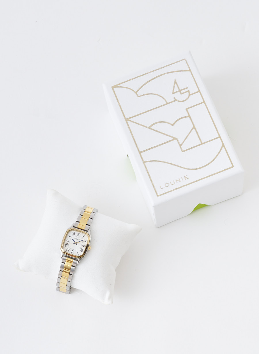 文字盤の「12」の部分にはLOUNIEのロゴを入れています。時間を刻む針部分の色を深いブルーの色味にする事で、優しさと上品さを兼ね備えた印象に仕上げたこだわりのカラーリング。