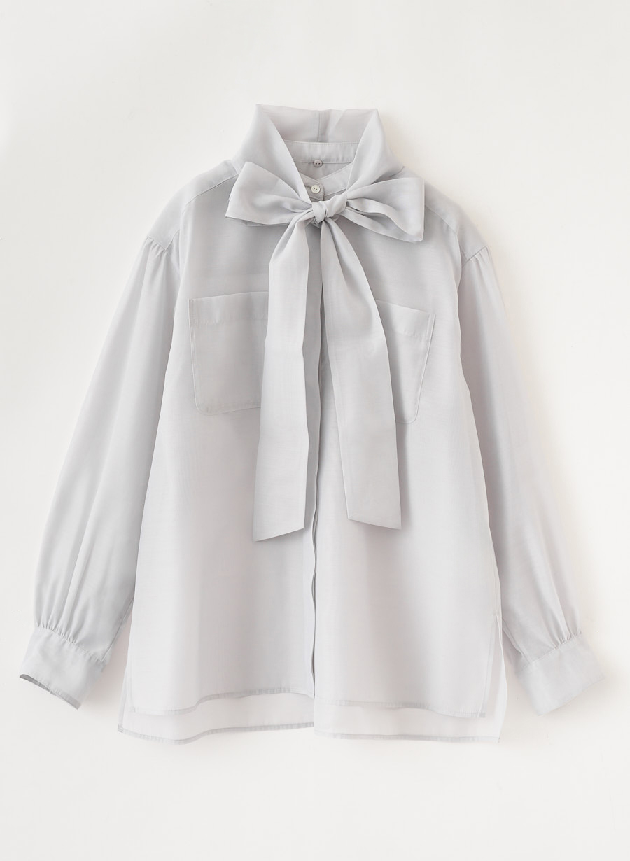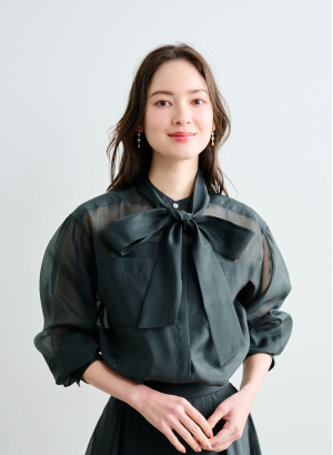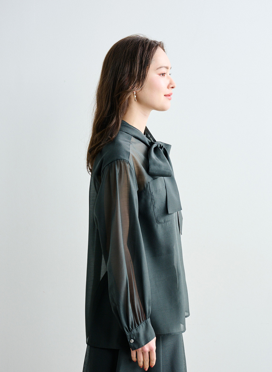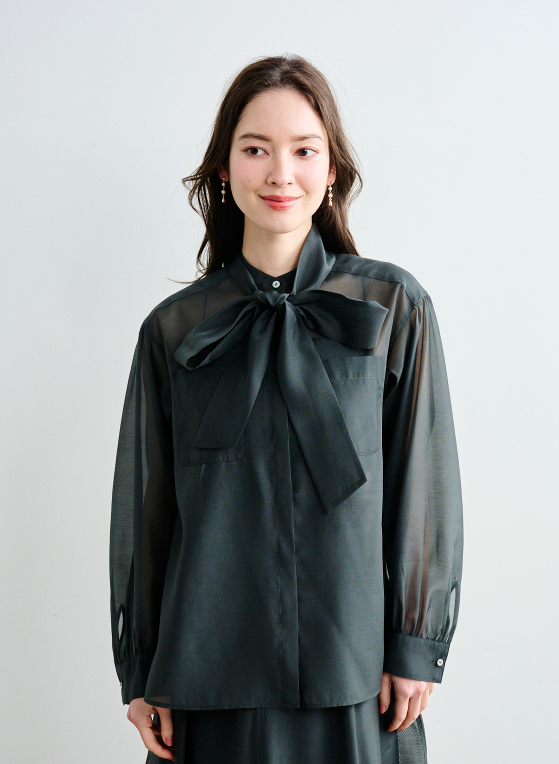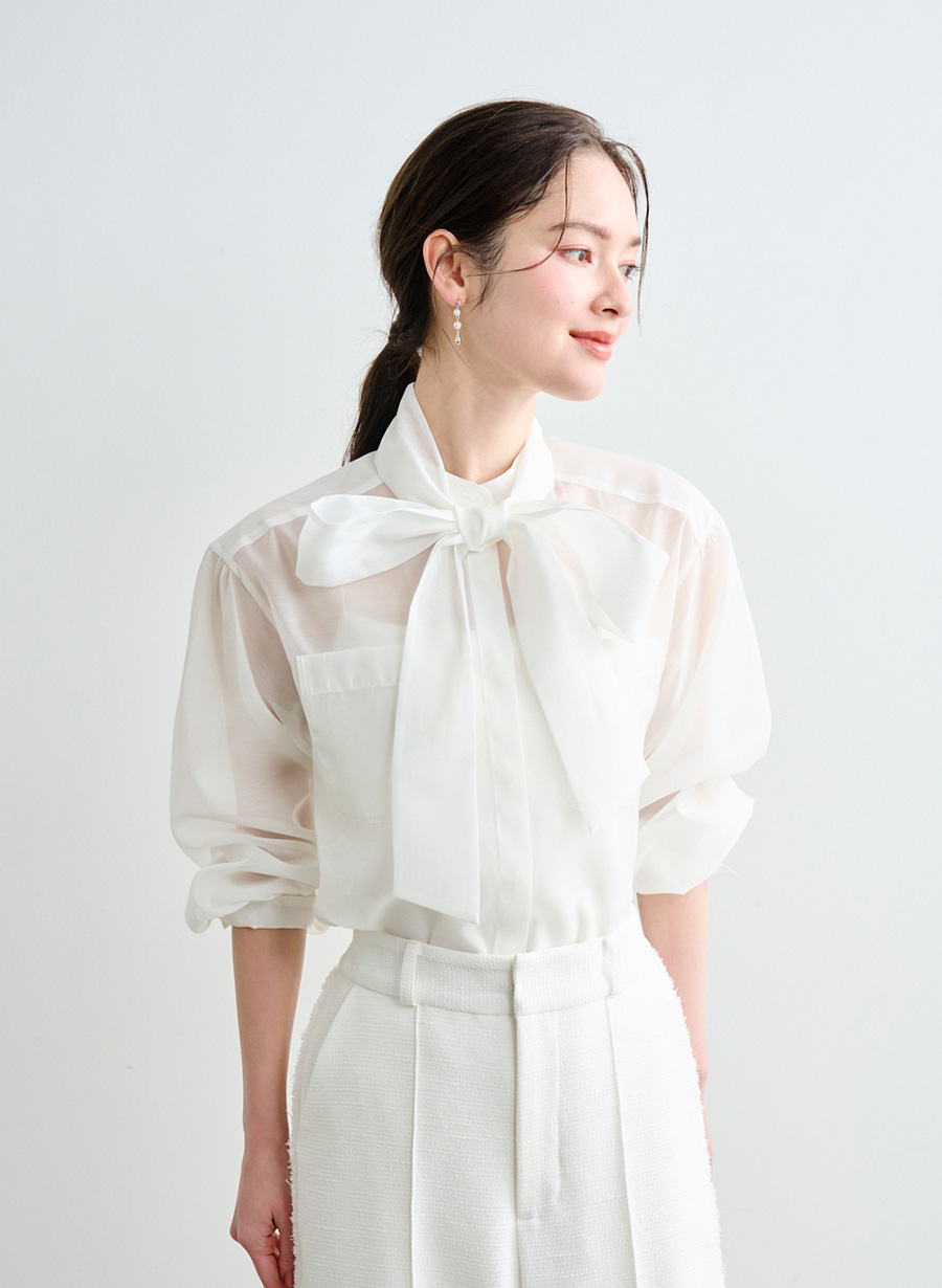 ・ 素材により立体的なフォルムに仕上がるボウタイブラウス。