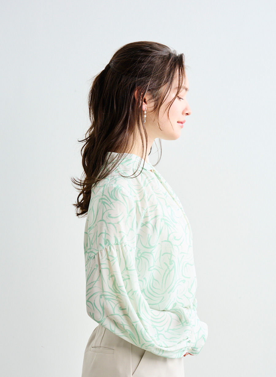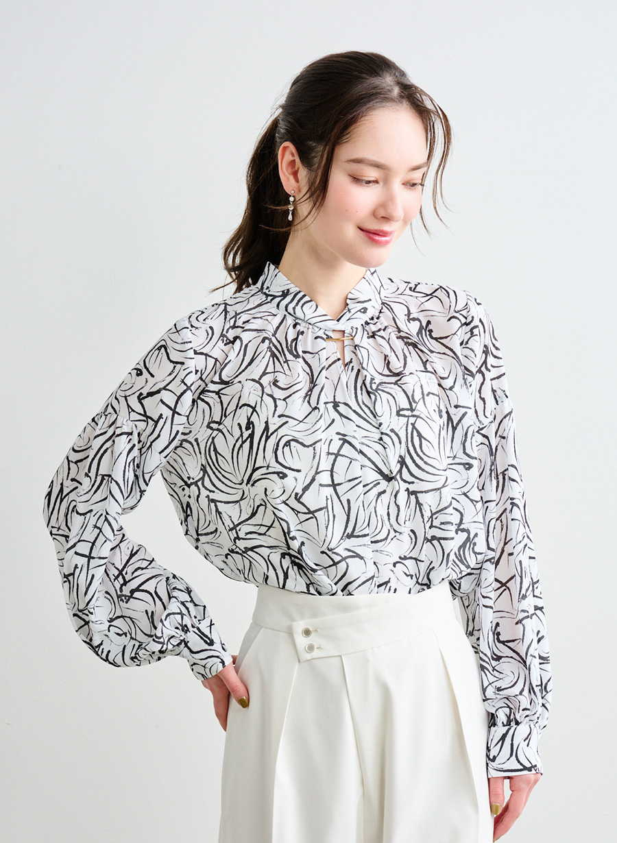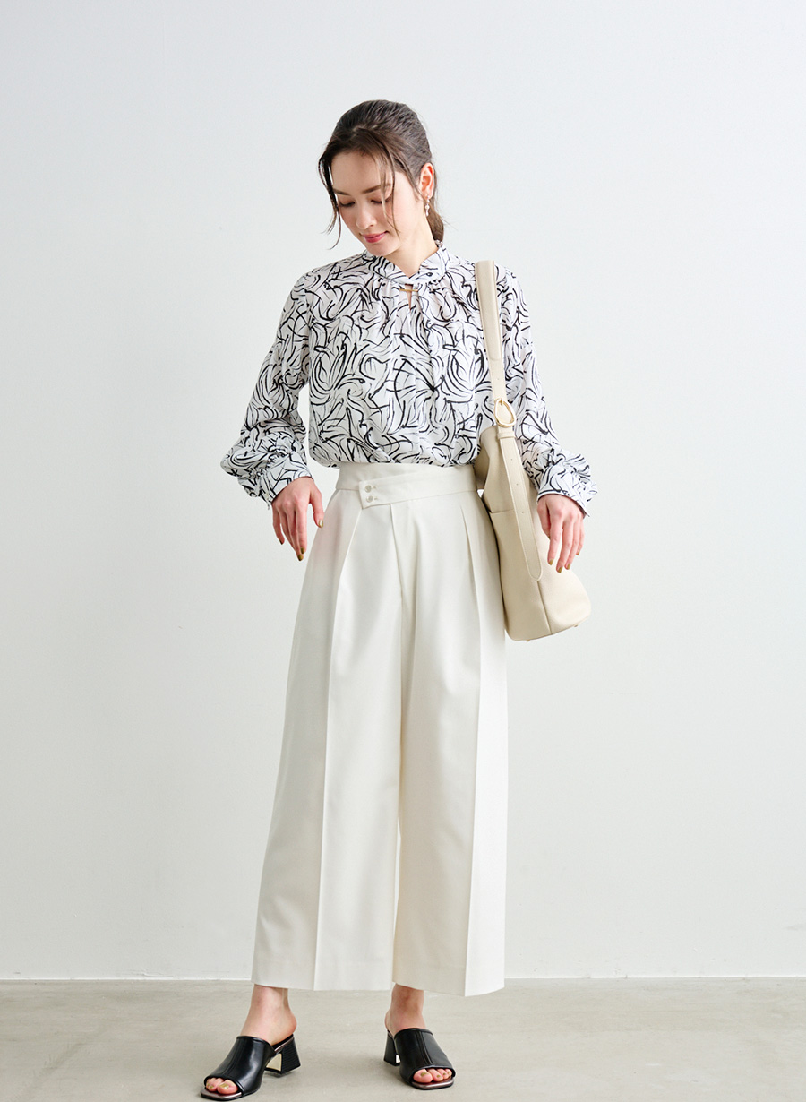 ・ 衿元は、ひねりを加えたスタンド衿が立体的なニュアンスをプラス。