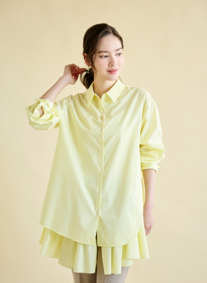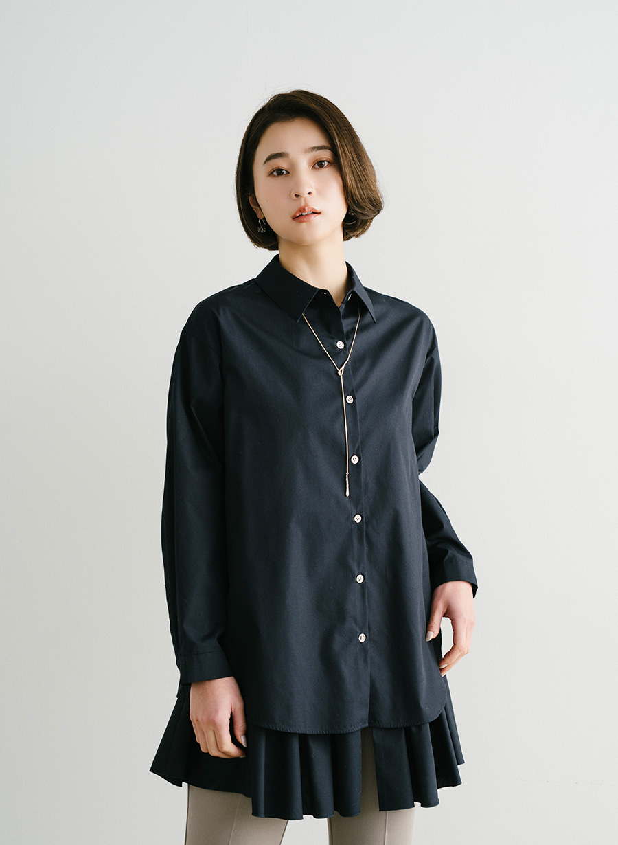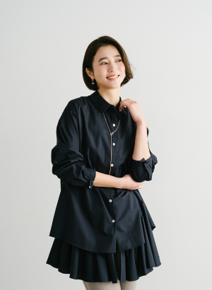 ・ すっきりとしたシャツをベースに、裾には大胆で大きめのラッフルを贅沢に施したデザインチュニック ・チュールの裏地にラッフルをハギ合わせることでより優しい立体的なラッフルに仕上がっています。