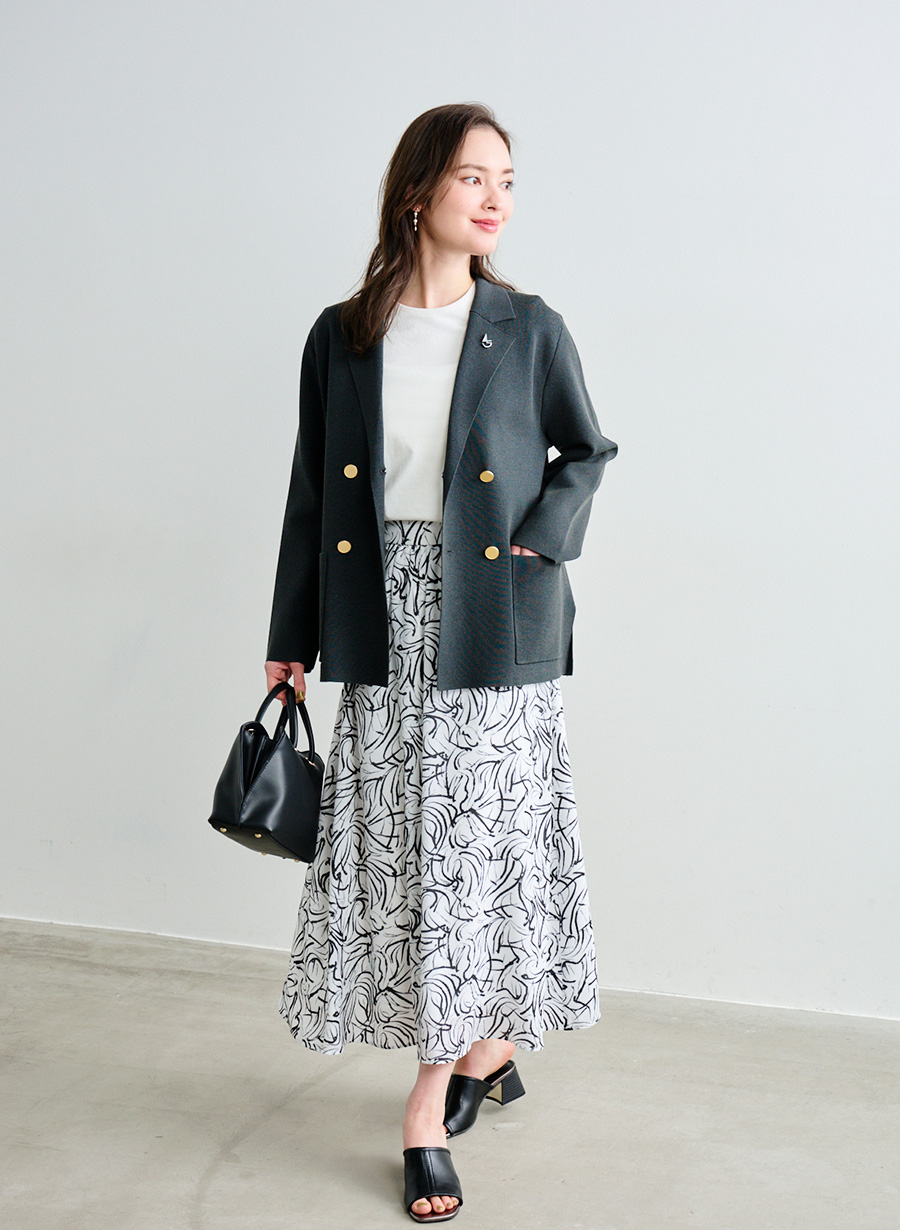 ・ 華美になりすぎない上品な素材感とシルエットで、オフィススタイルから、デイリー、きれいめなお出かけまで幅広く活躍する万能な一枚です。