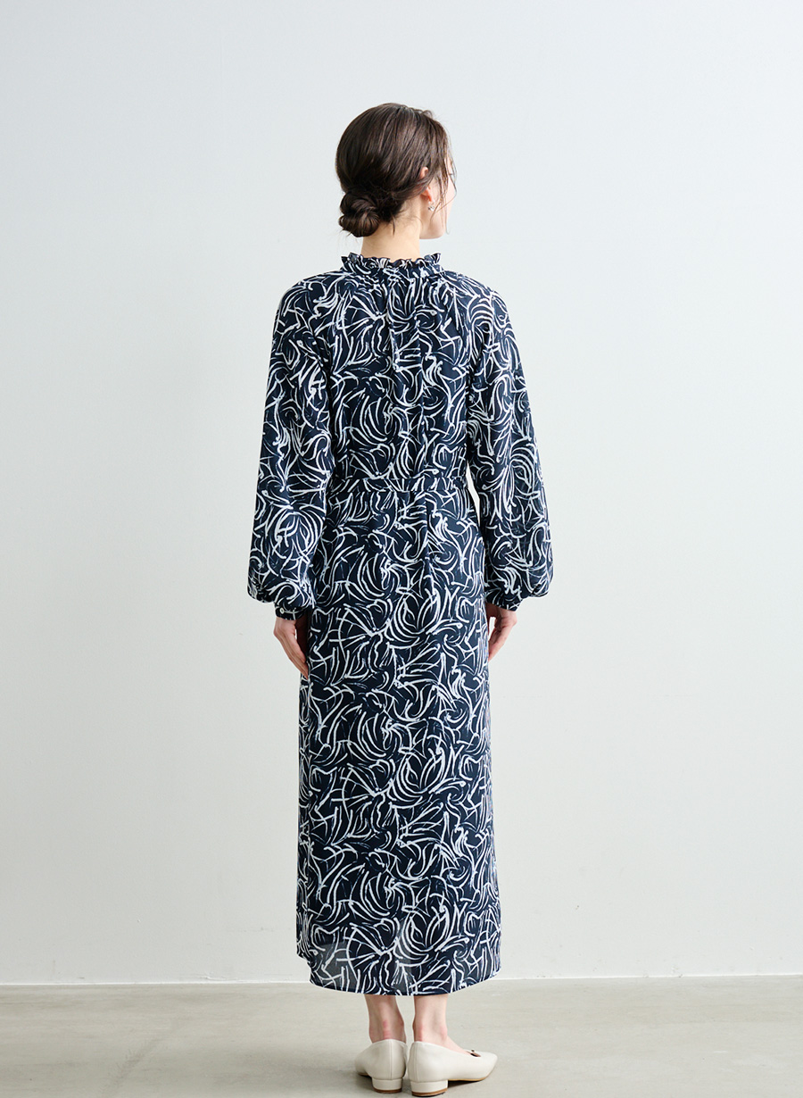 ・ ネックラインは、スタンドカラーにささやかにフリルを施し、さらに フロントスリットが縦ラインを強調し、顔周りをすっきり見せてくれます。