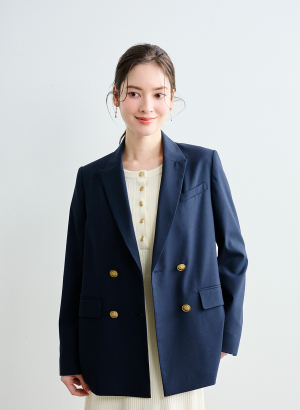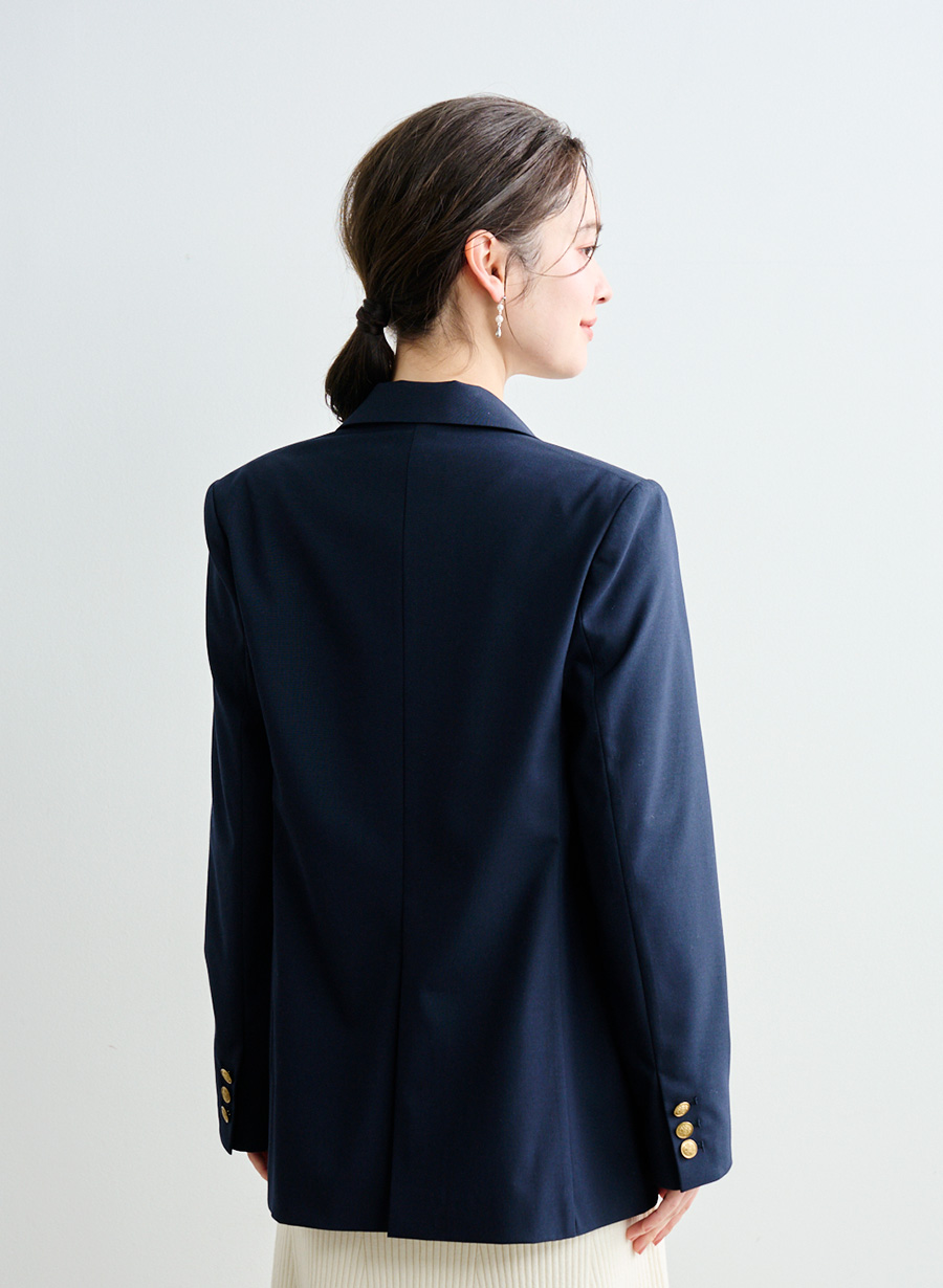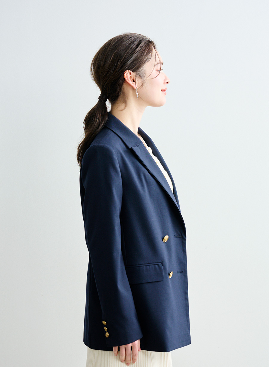 ・高級感あふれる素材を使用し.クラシカルなダブルブレストデザインに、華やかな金釦を配することで、マニッシュでありながらも女性らしさを感じる上品な一着に仕上げました。