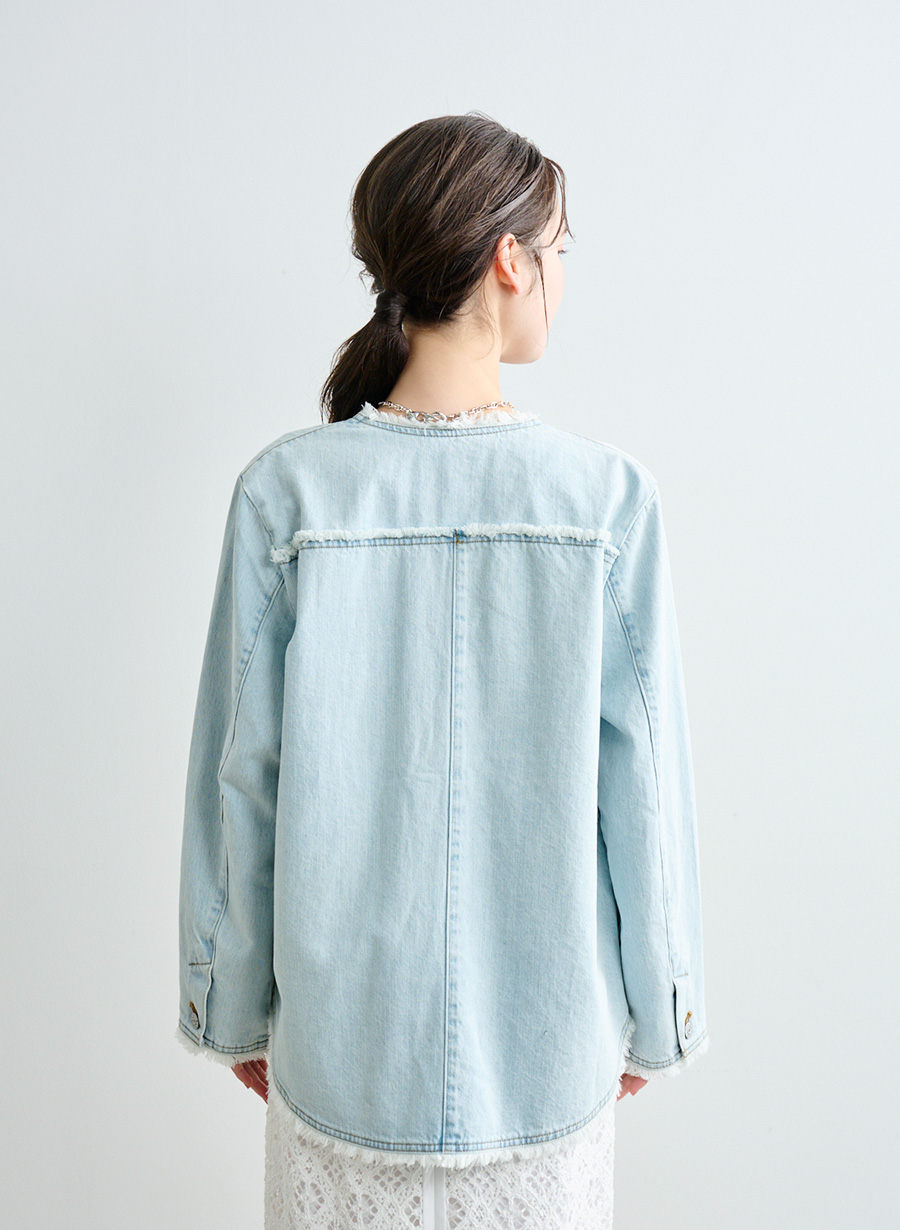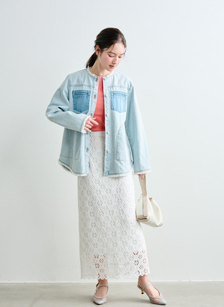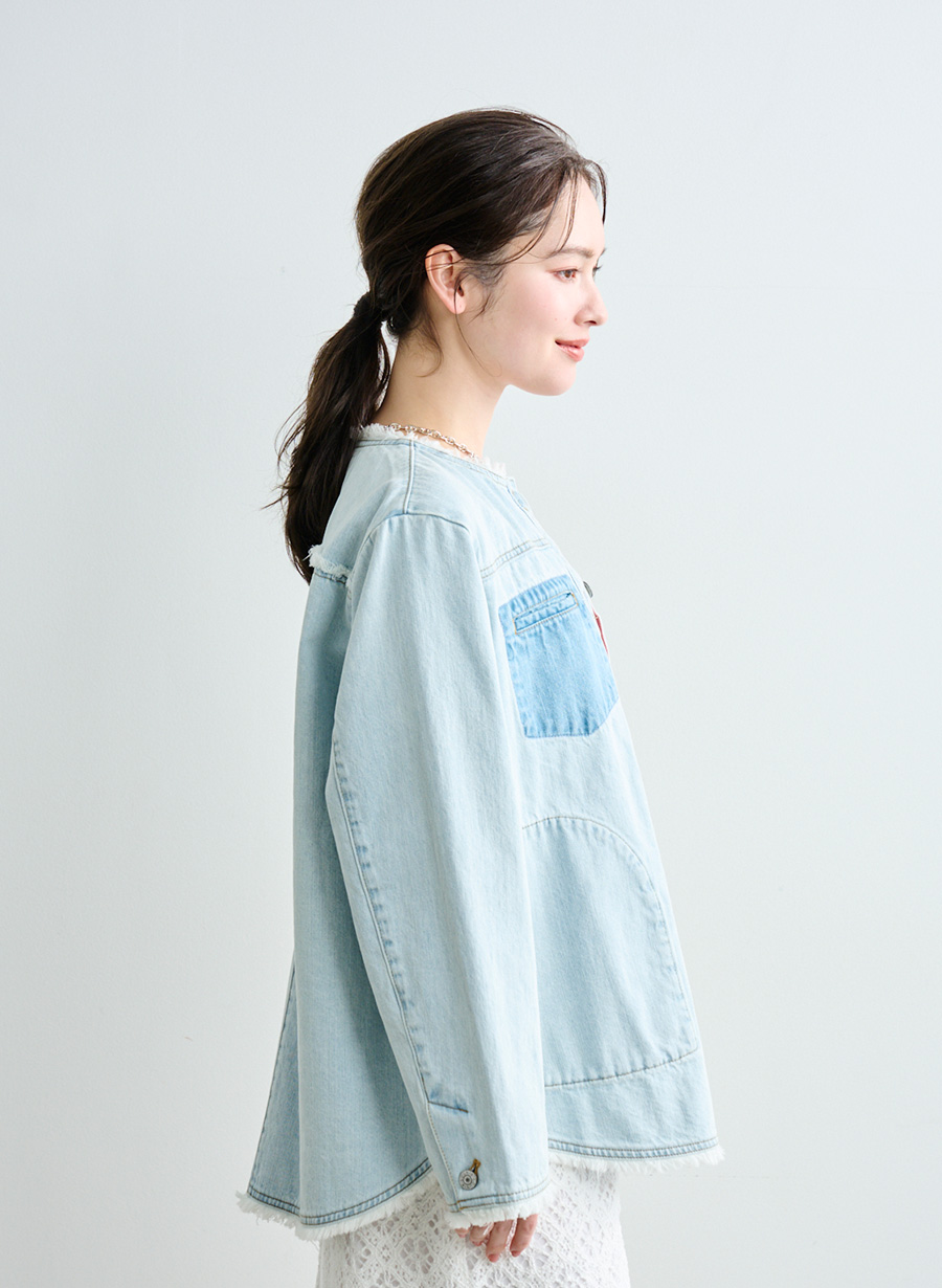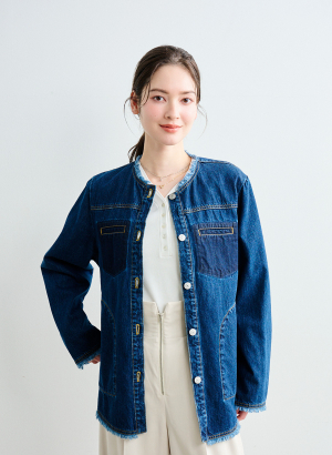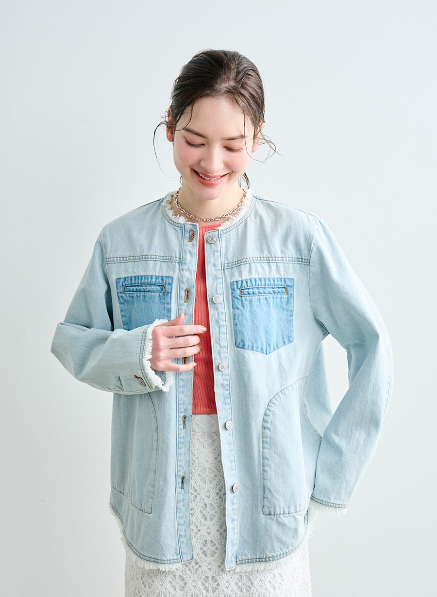 ・ポイントのリメイク風デザインポケットで一気に洗練された印象のノーカラーデニムジャケット。