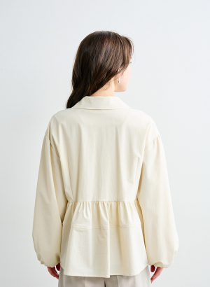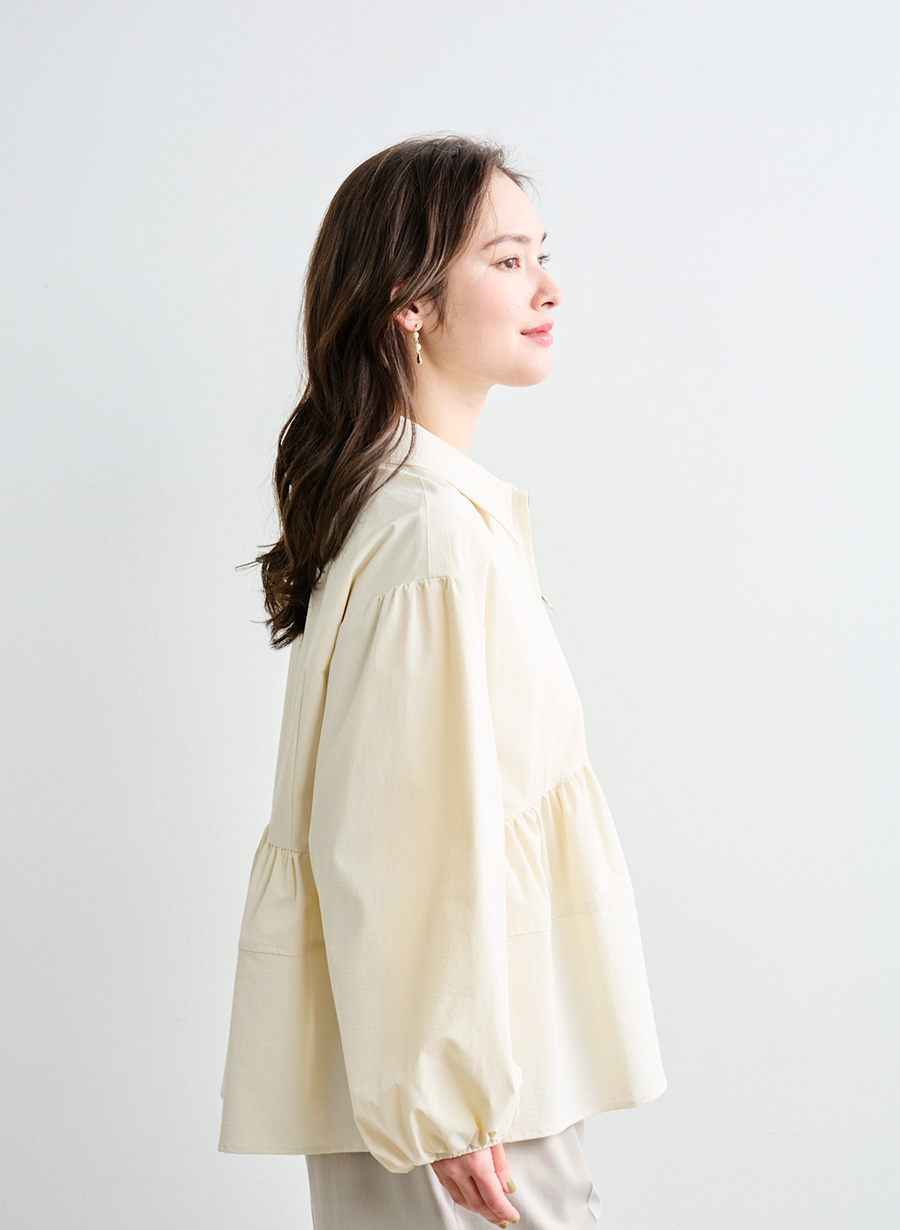 ・ ウエストからふわりと広がるペプラムディテールが、気になる腰周りをカバーしつつ、 腰位置を高く見せてくれるのでスタイルアップ効果。