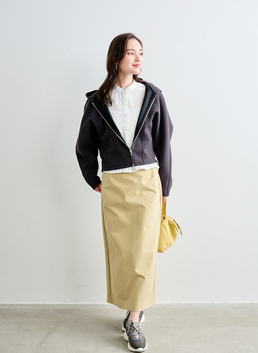 ・逆開ファスナーで裾の開き具合を調整でき、様々なボトムスに対応可能です。
