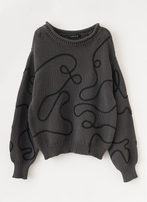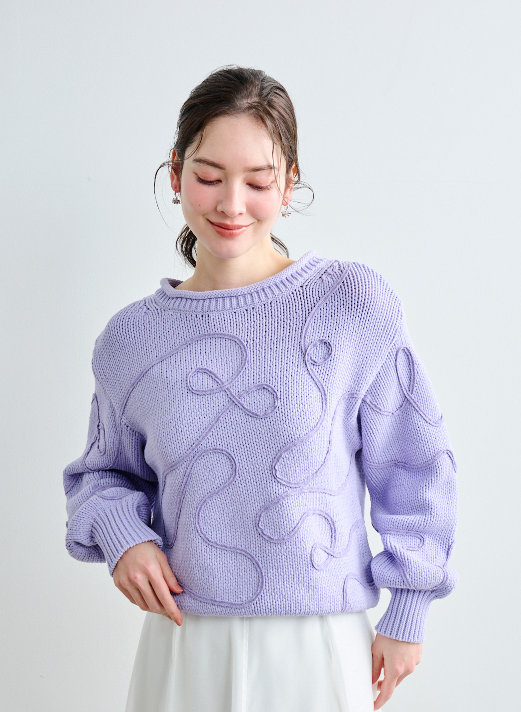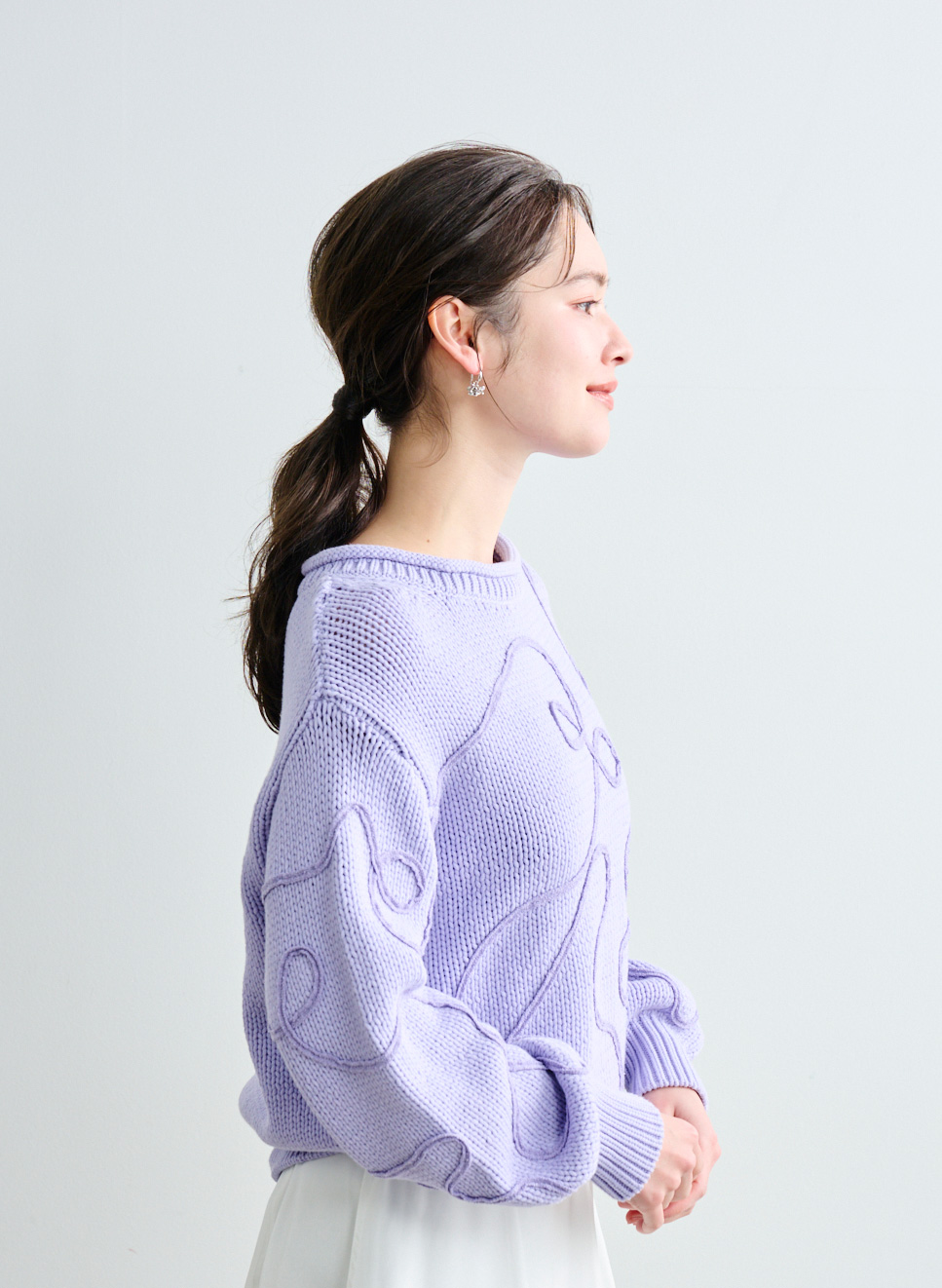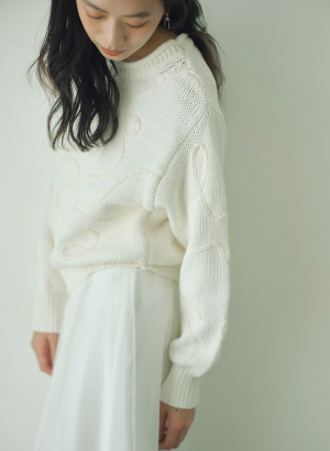 ・ざっくりとしたローゲージのボディにミニブークレで編み立てたコードテープを大胆に刺繍したニットトップスです。