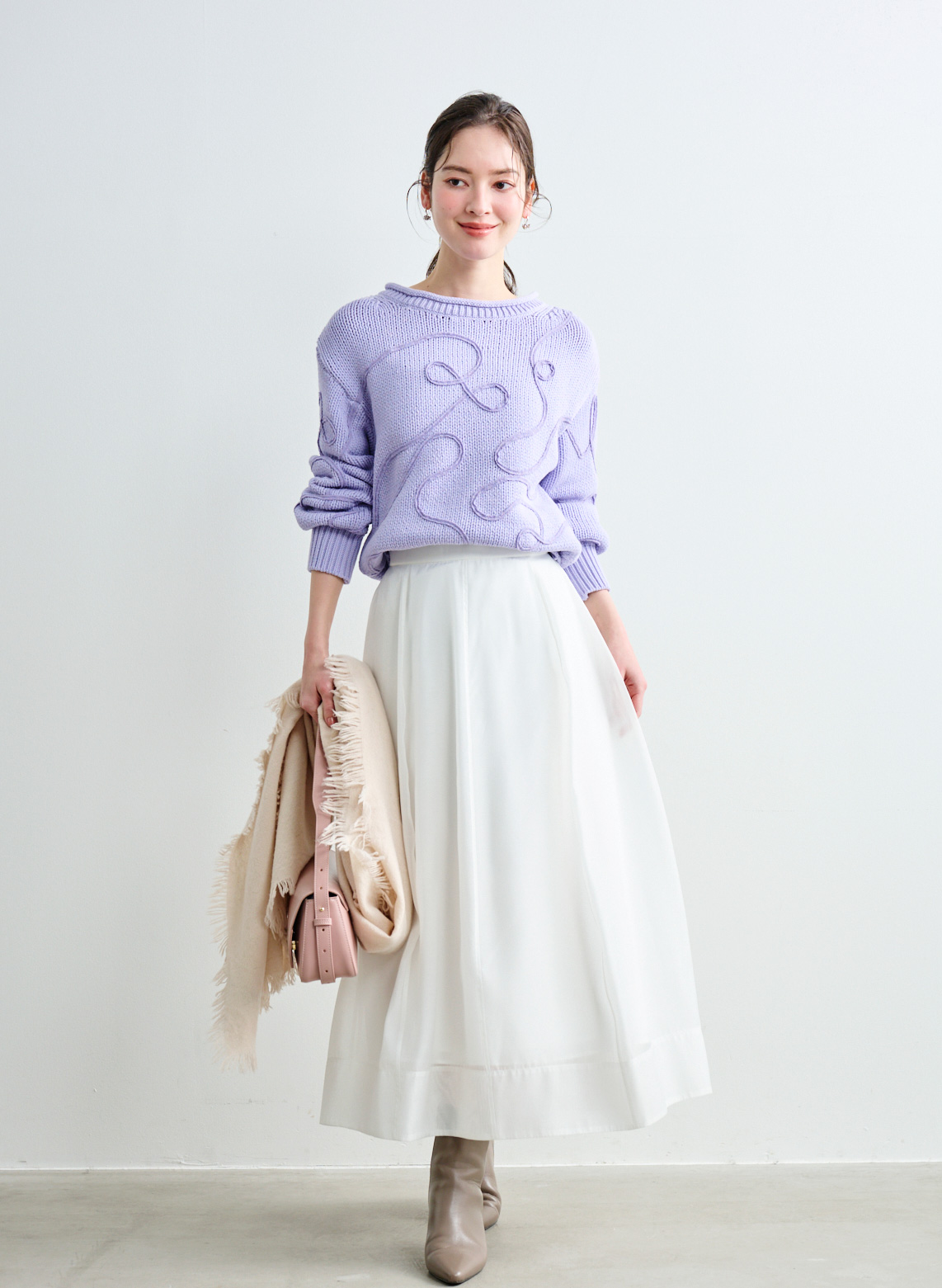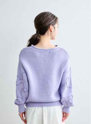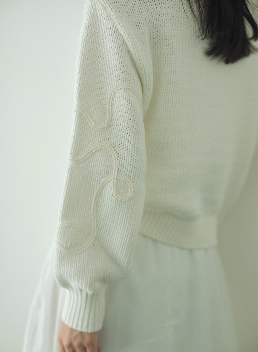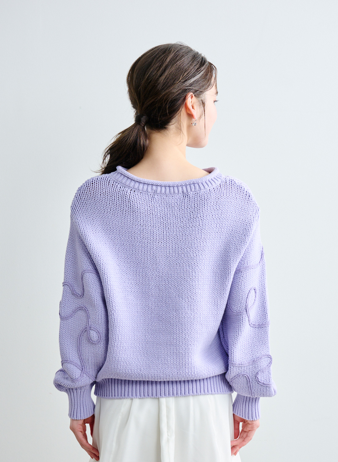 ・ざっくりとしたローゲージのボディにミニブークレで編み立てたコードテープを大胆に刺繍したニットトップスです。