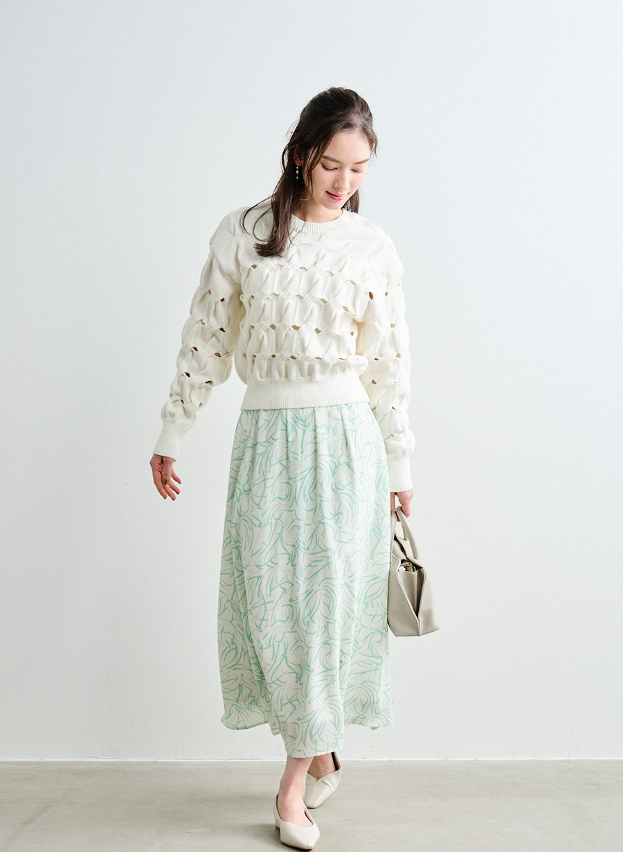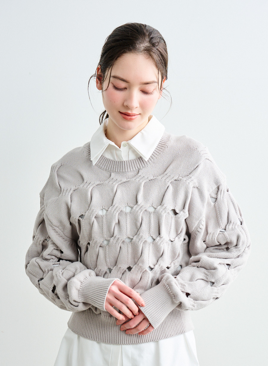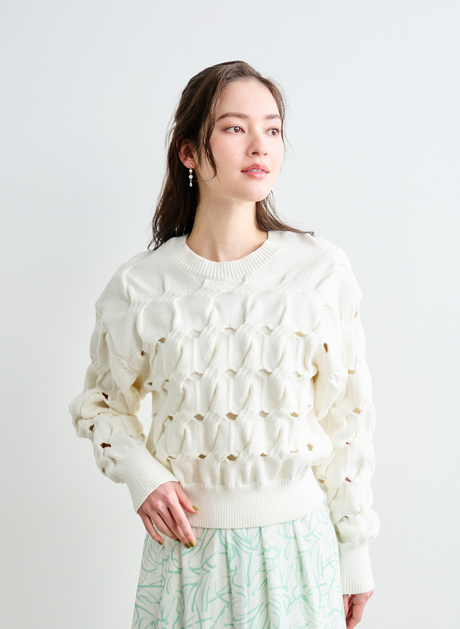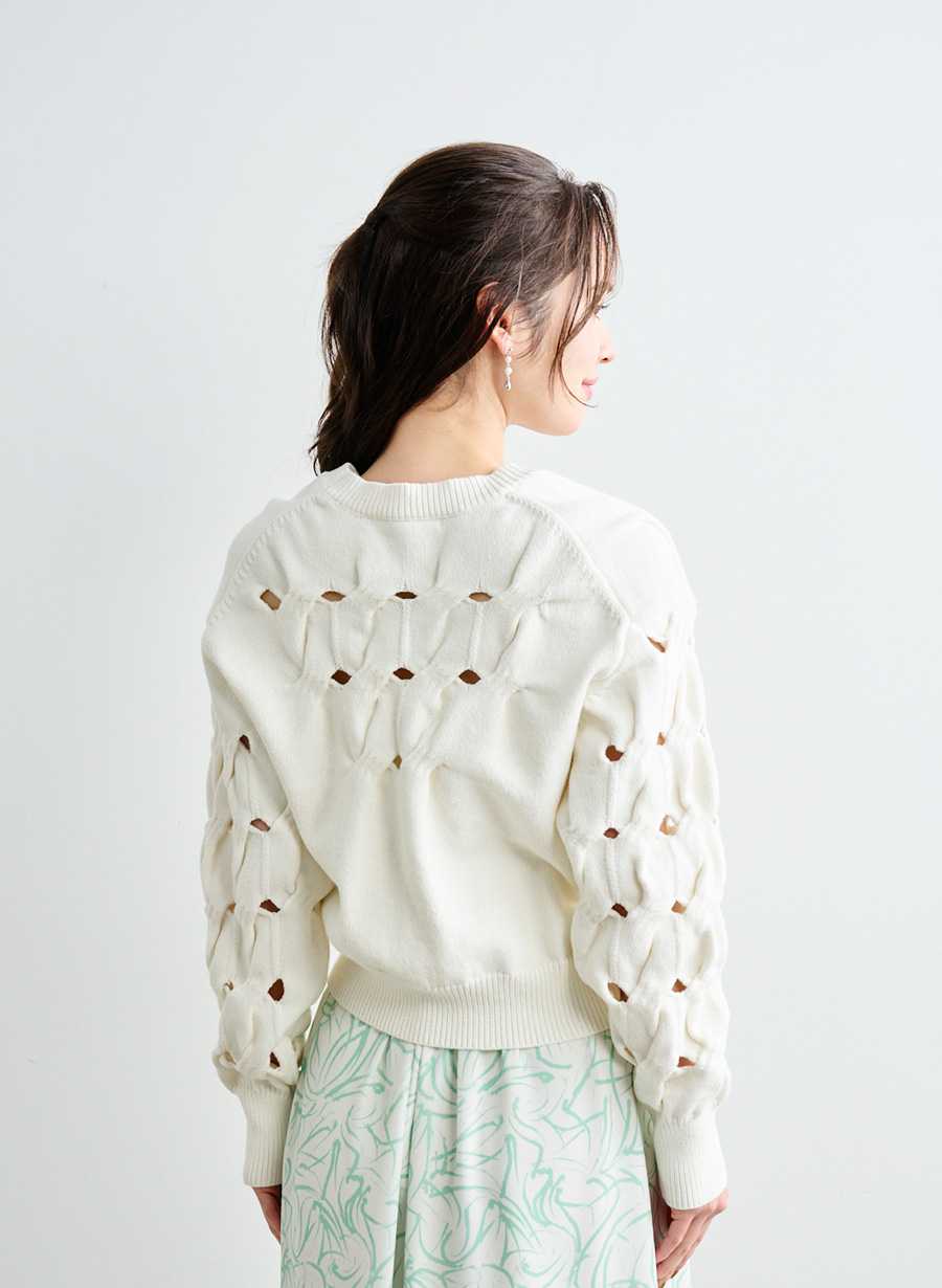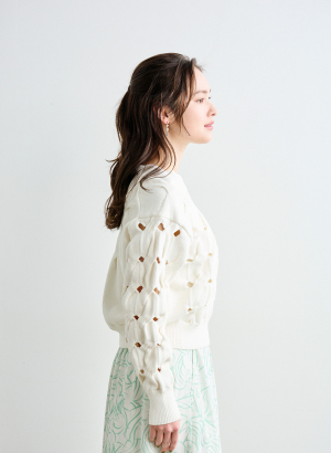・ドライタッチのコットンナイロンリリヤーンを使用しており、春らしいケーブル編みになっています。