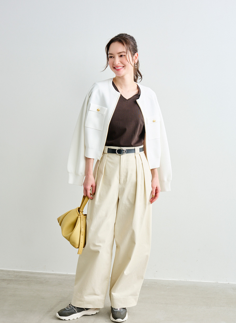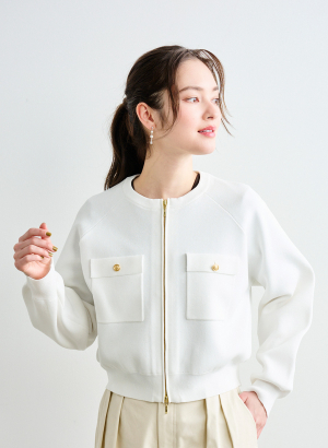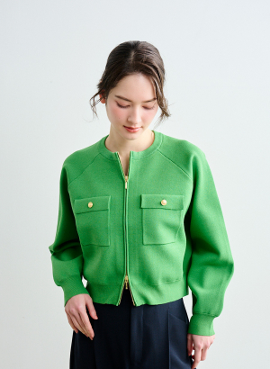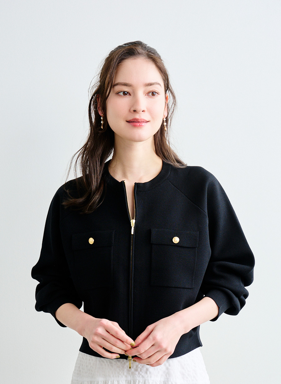 ・アウターライクなニットに適した、膨らみと嵩のある無地ダブルジャカードの編地を採用。