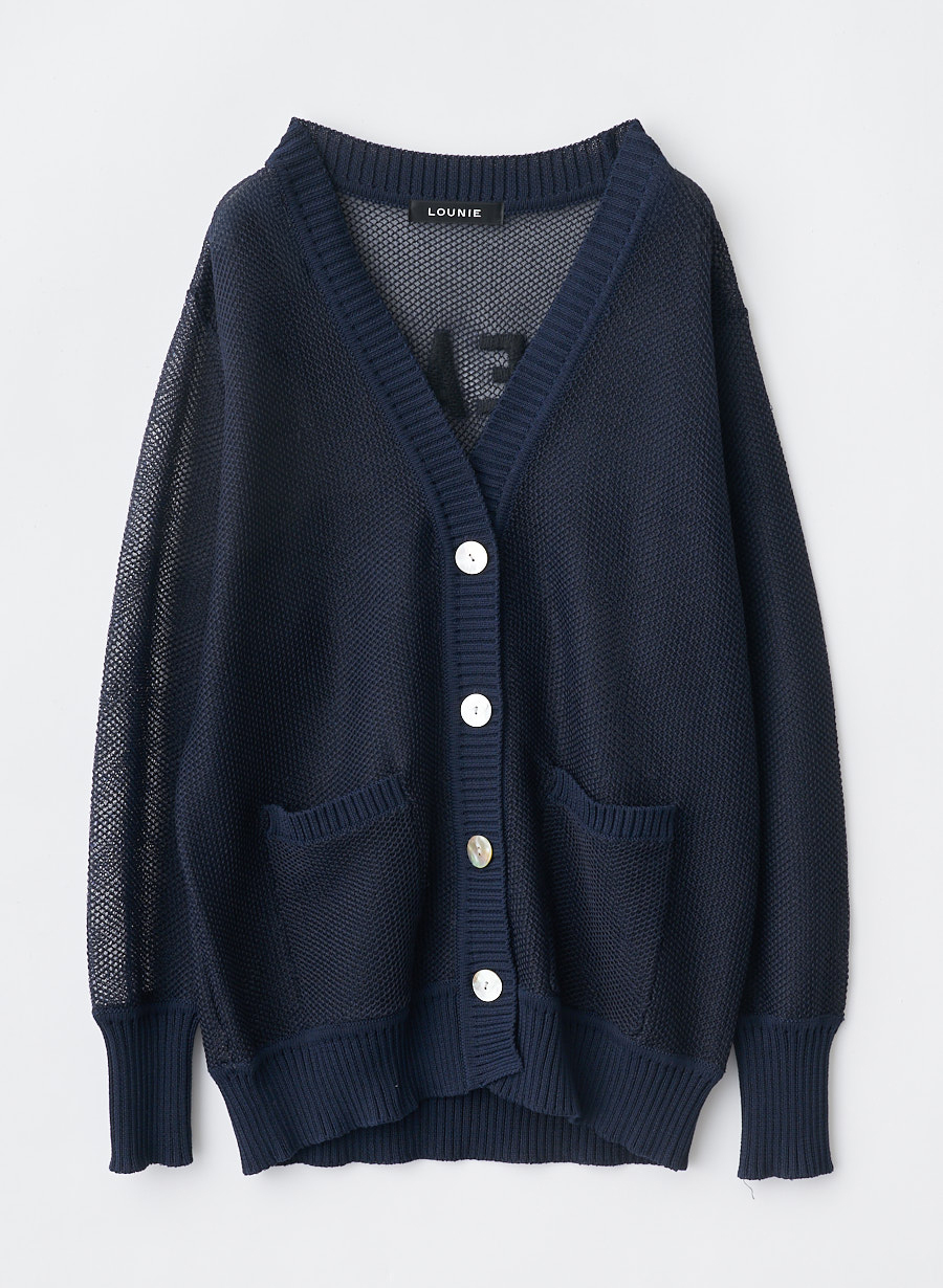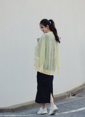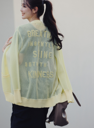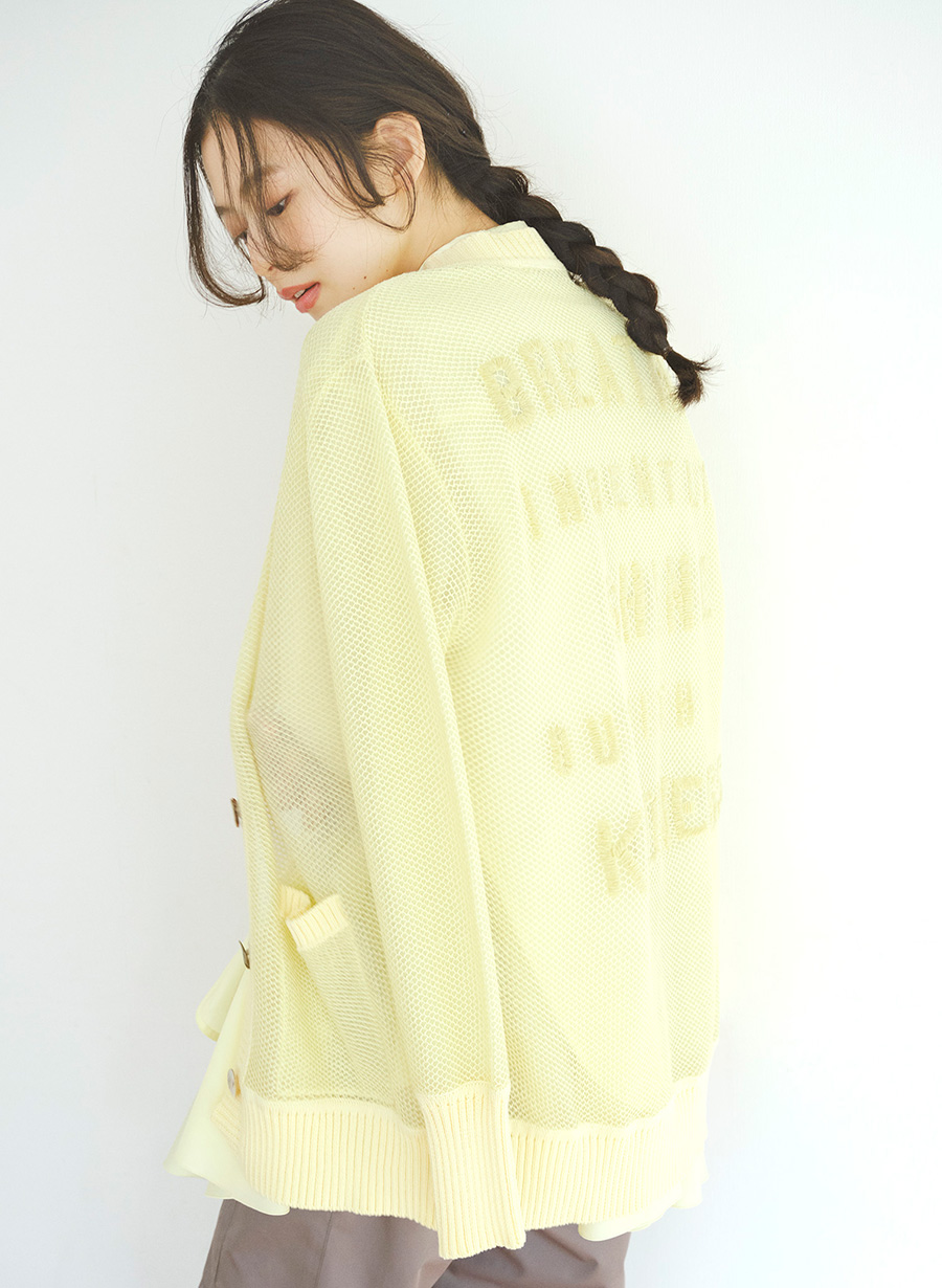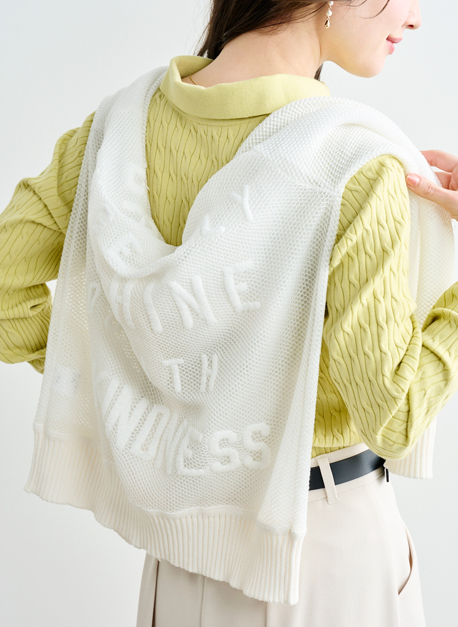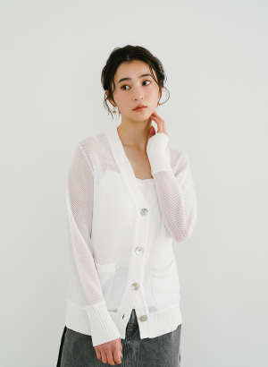 ・ボディは細く透ける糸とポリエステル糸をメッシュ状のジャカード編みで軽やかに編み立て、前立てやリブは本取りを増やした異ゲージ編地でしっかりと仕上げています。
